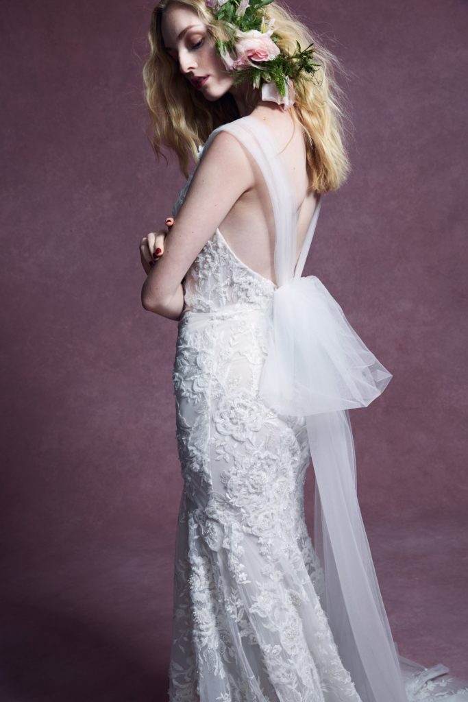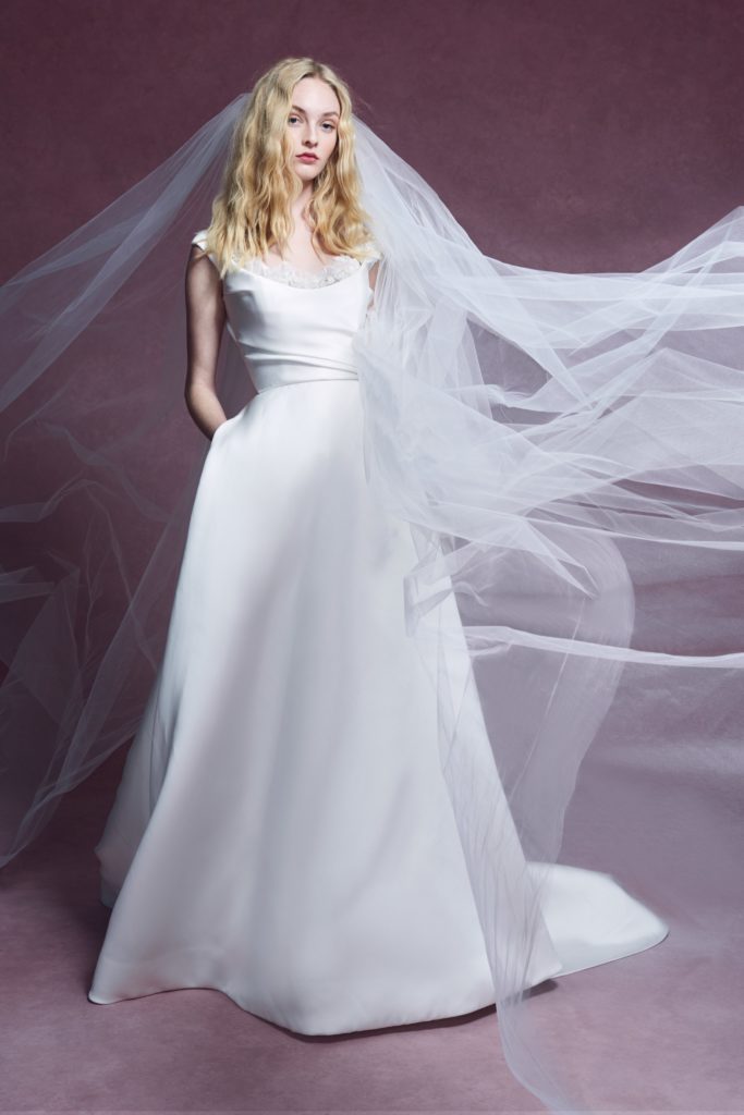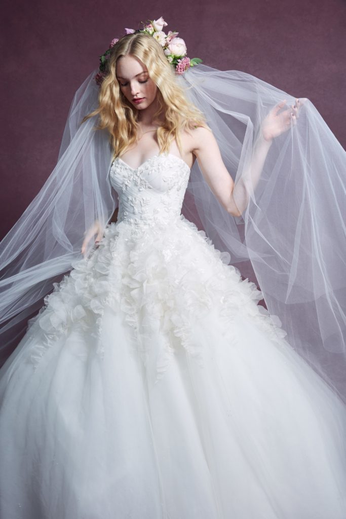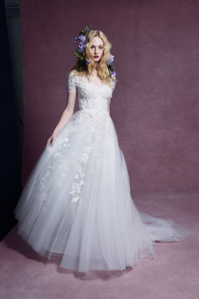 Questo concetto trova forma in abiti da sposa dall’incredibile leggerezza, che notiamo specialmente nei ball gowns per i quali al posto delle crinoline, gonne a strati e rigidi bustier, viene usato solo il tulle.