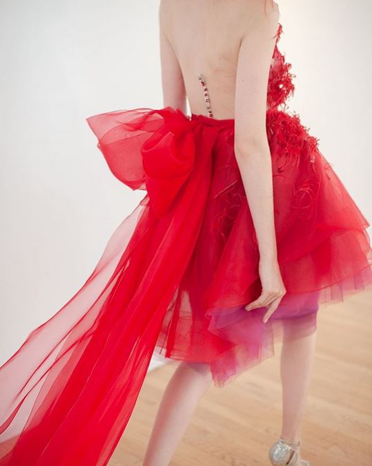 Originale e glam è l’abito da sposa rosso Bordeaux, un abito da sposa corto in tulle dalle diverse tonalità, con corpetto abbellito da piume e strascico rimovibile con fiocco e nastri.