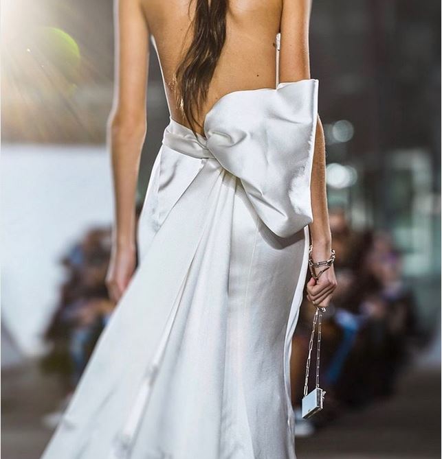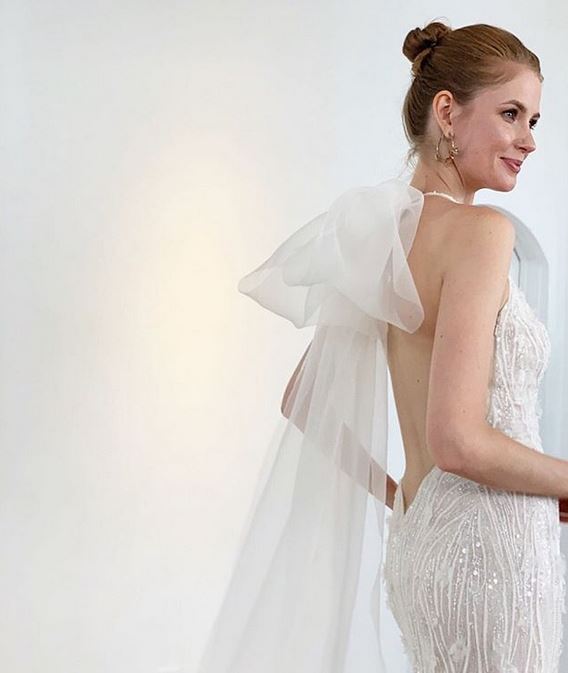 Davvero sofisticato, audace e glam l’abito da sposa Celia, un modello scivolato con collo alto, schiena velata e grande fiocco rimovibile.