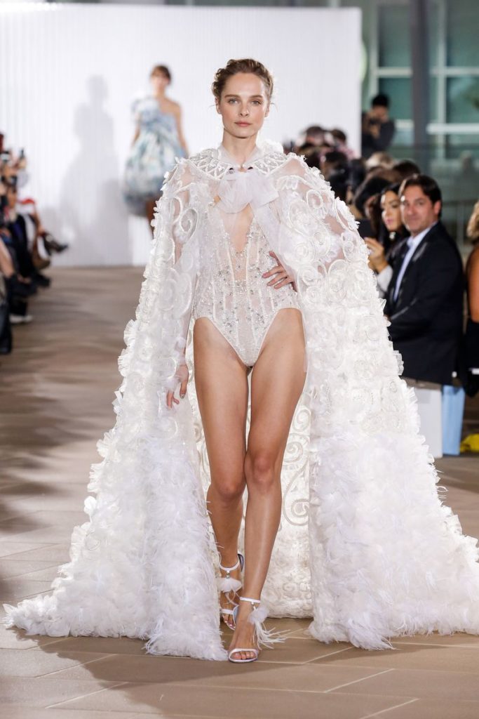 Davvero audace poi l’abbinamento del body in tulle, pizzo e cristalli con ampia mantella in tulle ricamato e abbellito da piume e punti luce, creato per il modello non a caso chiamato Eccentric, perfetto come abito da sposa per un matrimonio in spiaggia.
