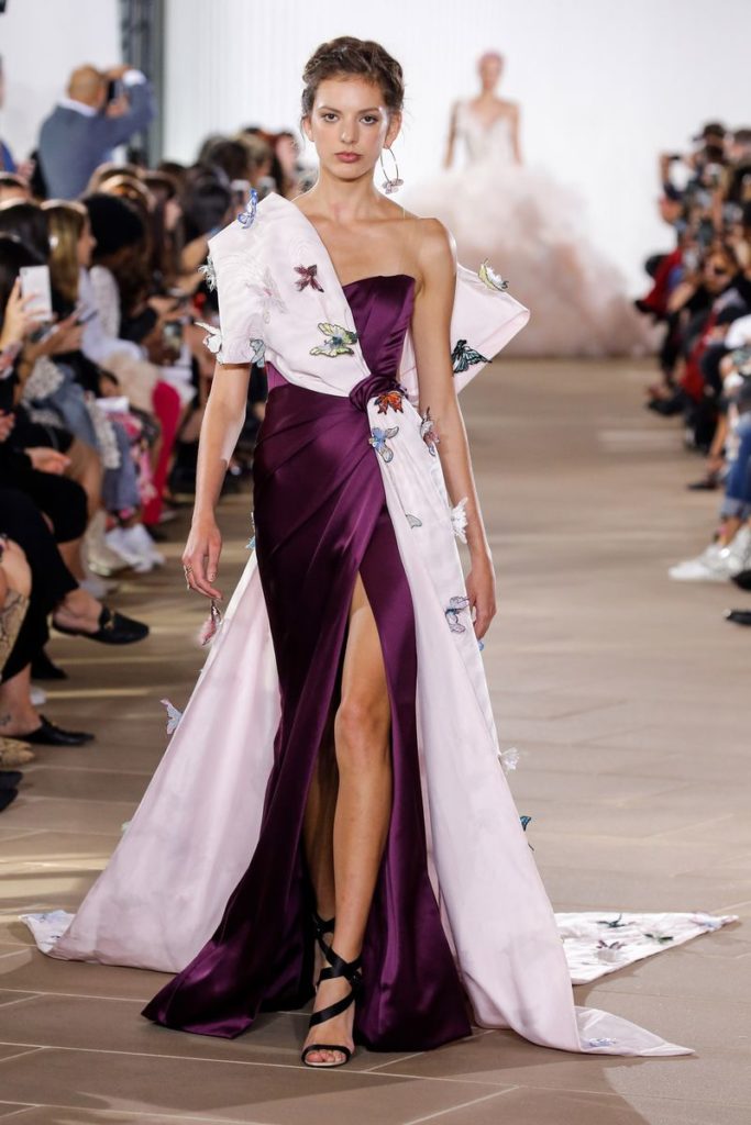 Ancora il colore è protagonista di un altro abito da sposa, il modello Harmonie, un sontuoso modello in satin che rappresenta al meglio la moda sposa couture, abbellito da fiocco asimmetrico e da farfalle 3D dipinti a mano e piume applicate.