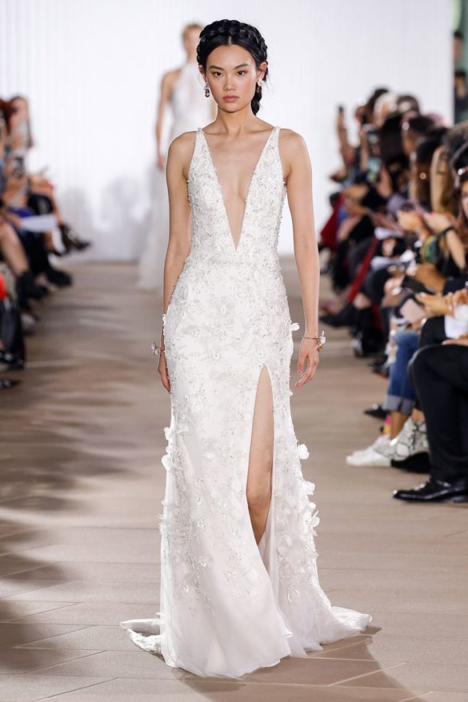 Molto audace l’abito da sposa Tempest, un abito abbellito da fitti ricami con ampio spacco e profonda scollatura.