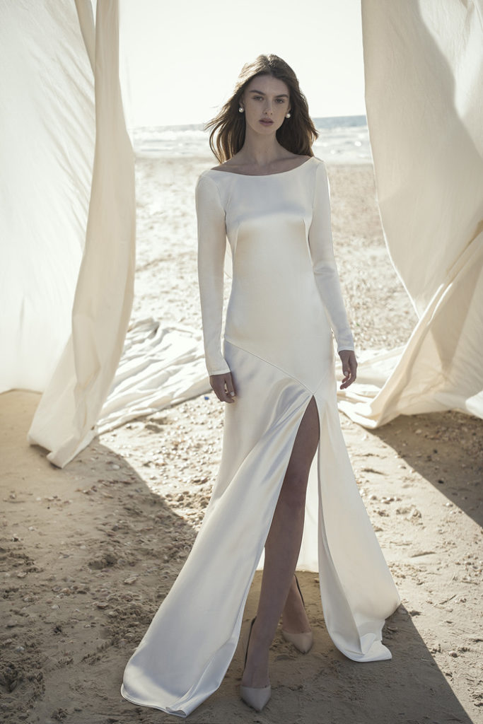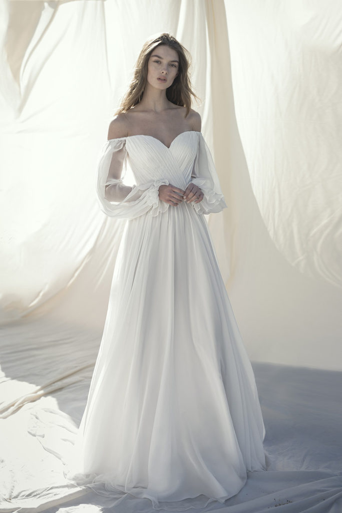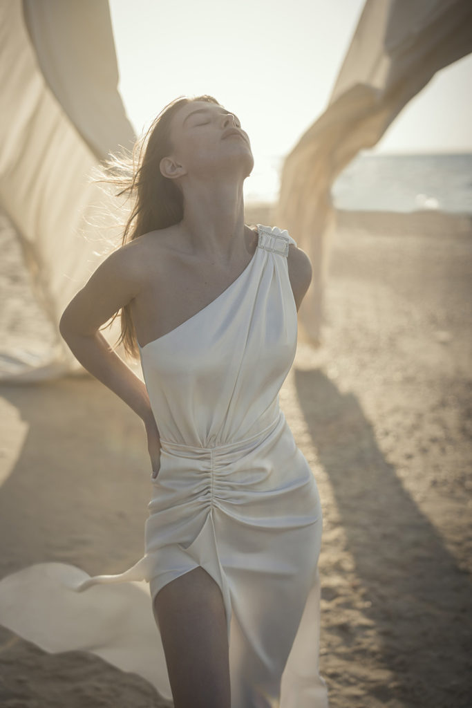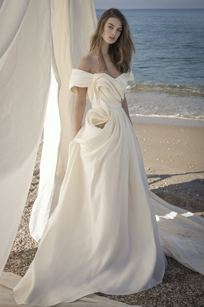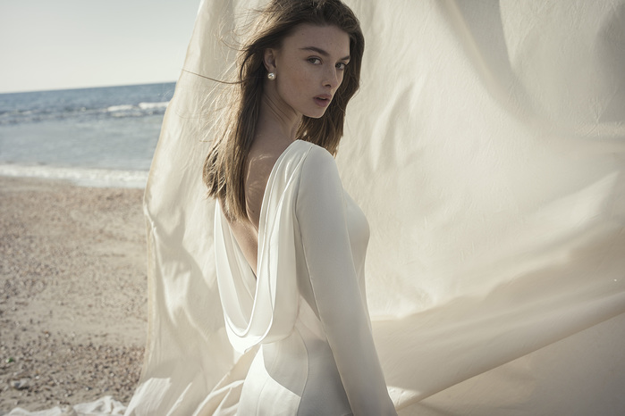 Davvero notevoli gli abiti da sposa drappeggiati che richiamano l’allure delle dive della Vecchia Hollywood, con corpetti ad avvolgere morbidi le forme e persino lunghi guanti tanto amati dalle star del cinema.
