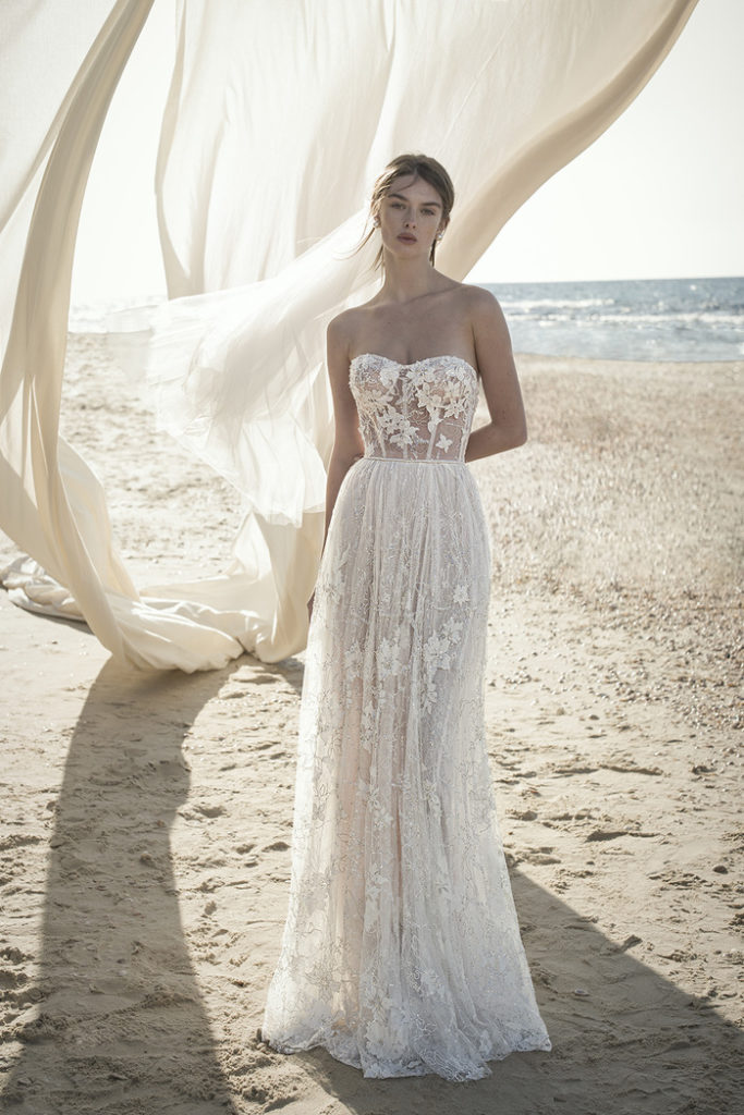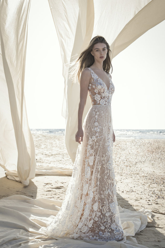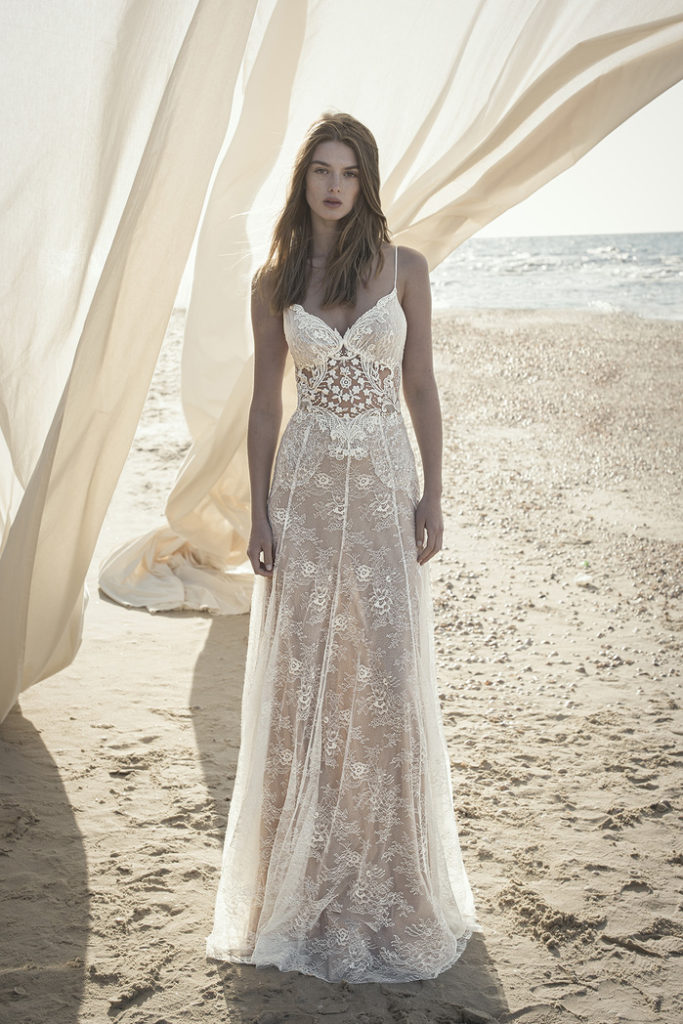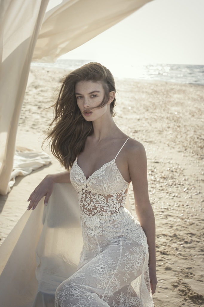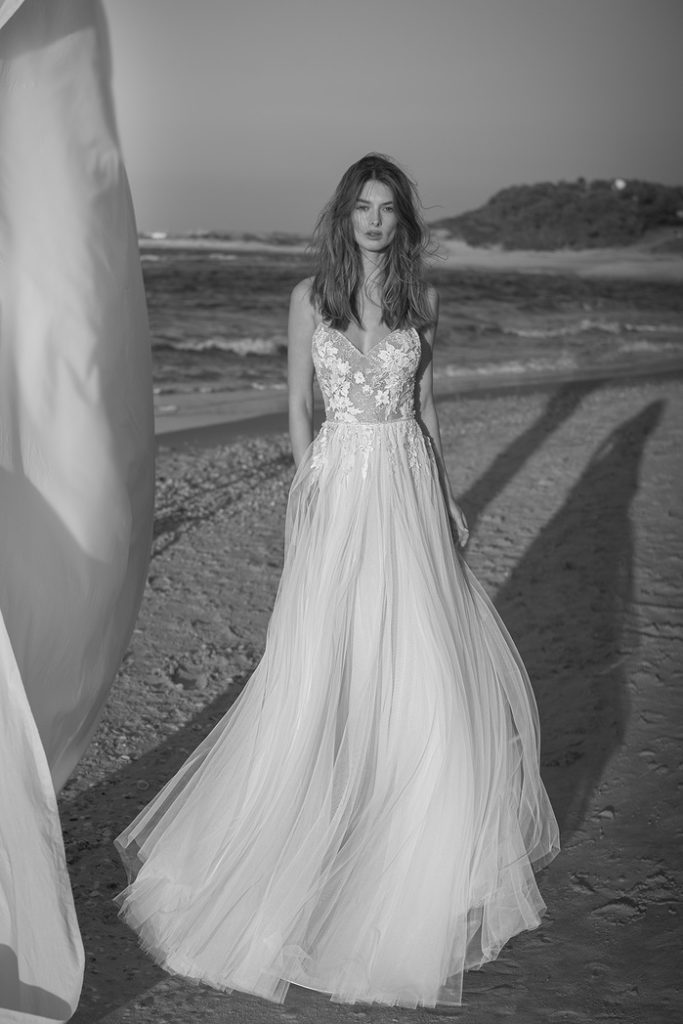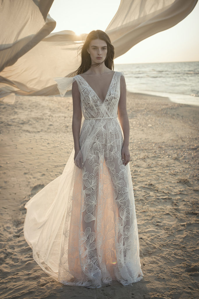 La delicatezza, che trova espressione negli abiti da sposa morbidi e abbelliti da pizzo e da ricami a mano su silhouette moderne.