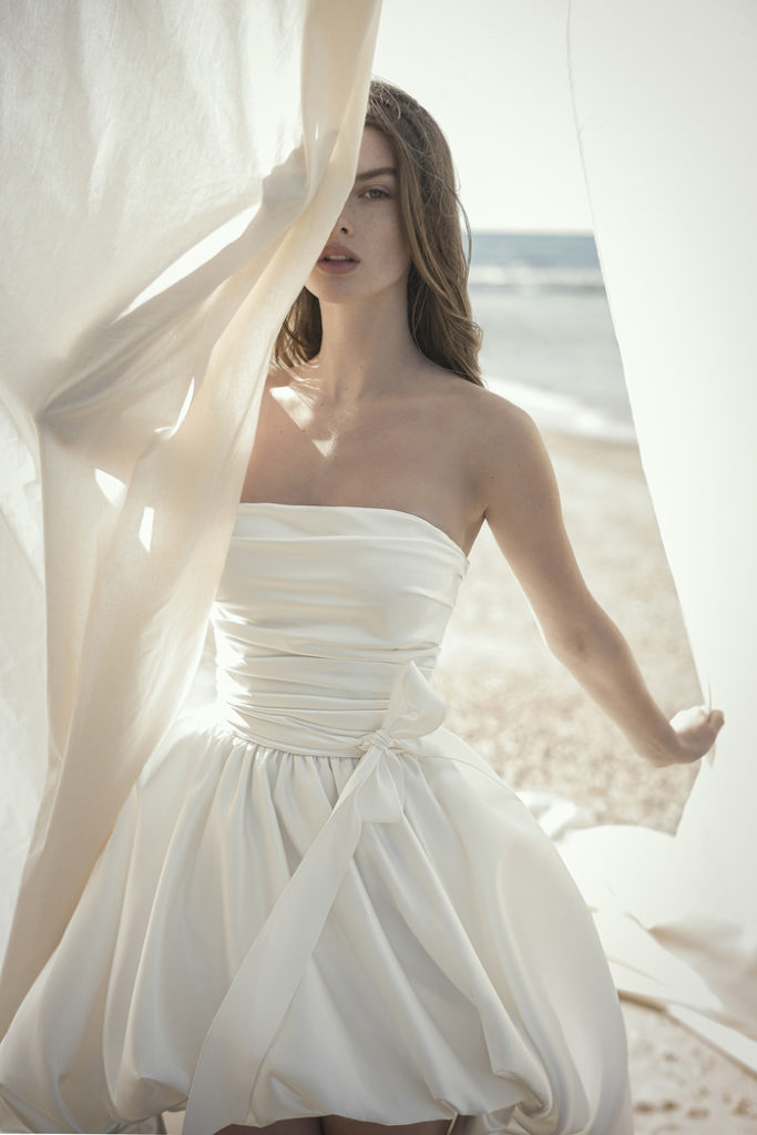 Tra questi, notevole l’abito da sposa componibile con gonna rimovibile e l’abito da sposa lungo-corto davvero romantico e galm.