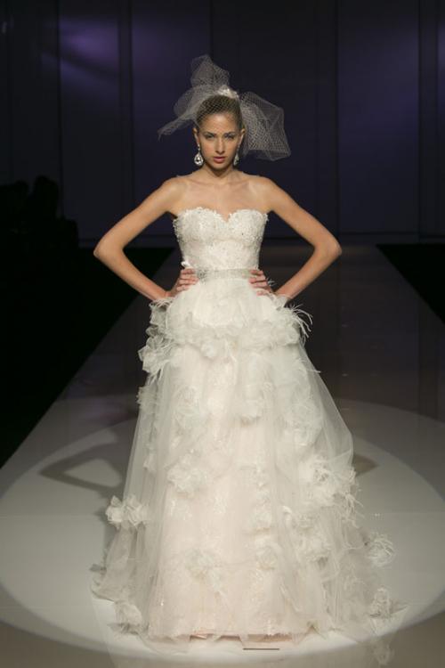 Sono modelli morbidi ma con tagli che formano architetture di tulle, piume, ricami.