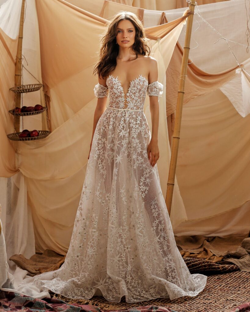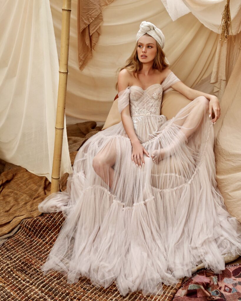 Inconfondibile dettaglio della linea Muse sono i punti luce, che emergono dagli strati di tulle e rendono questi modelli versatili, estremamente glam e perfetti anche come abiti da sera.