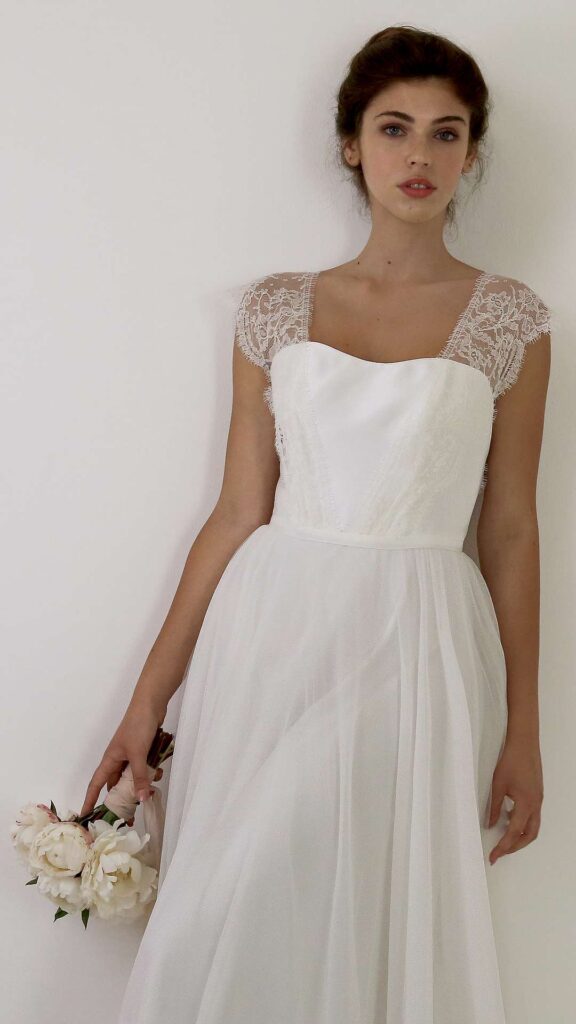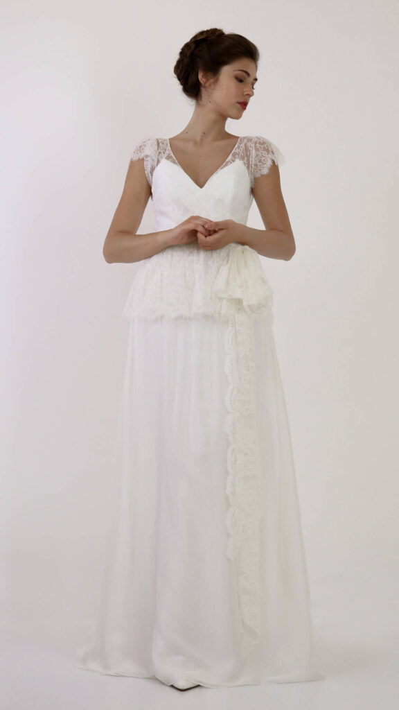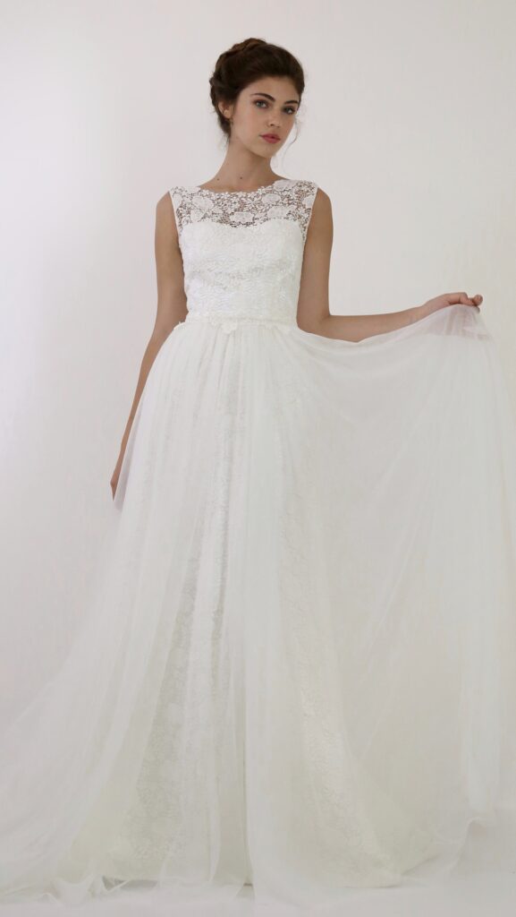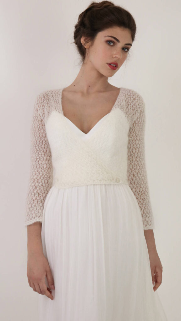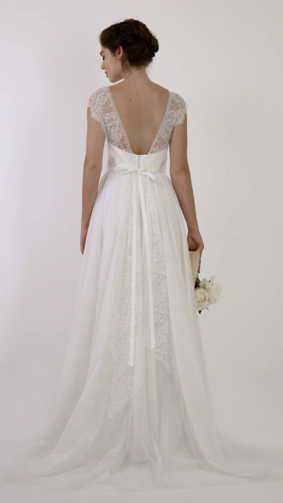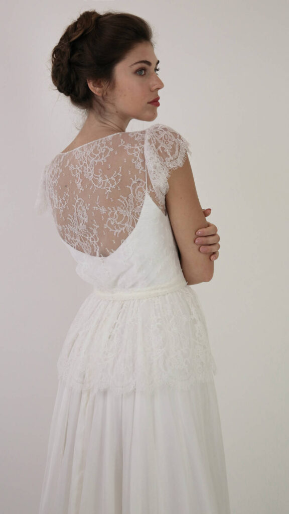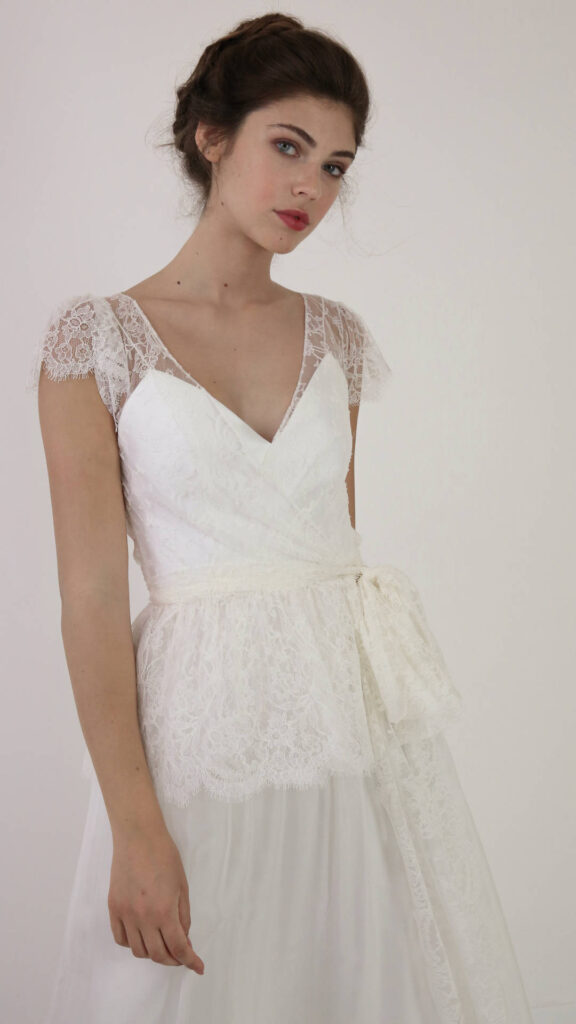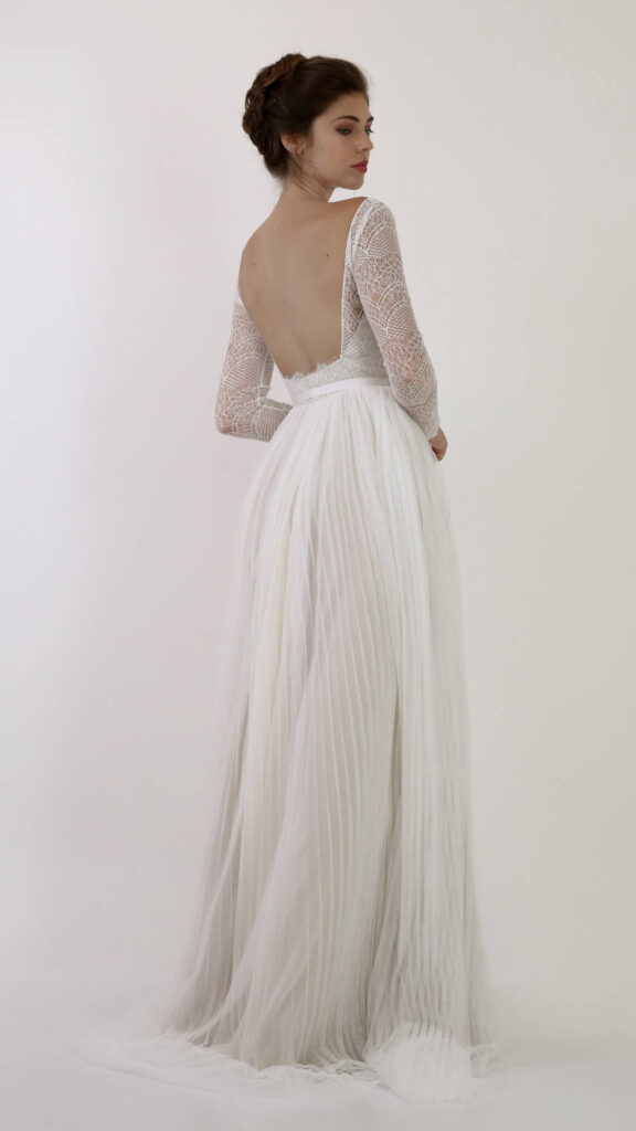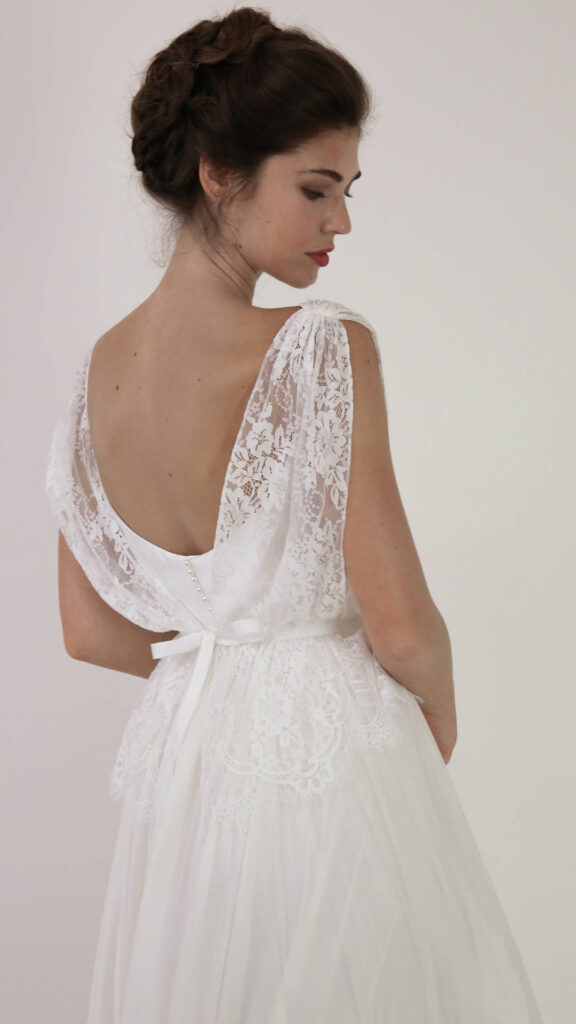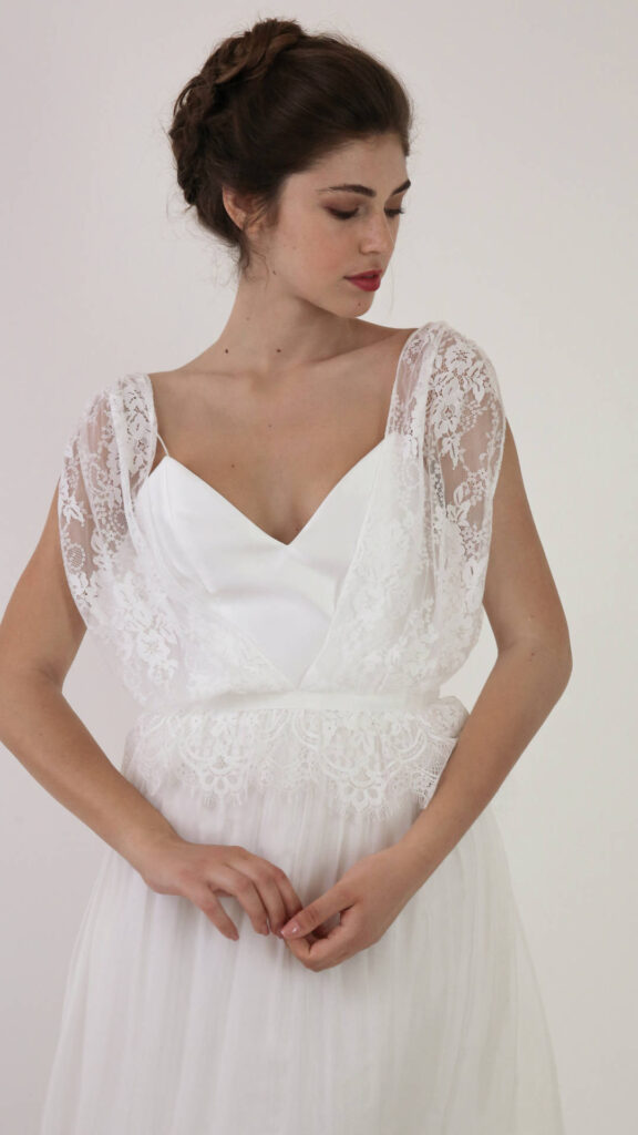 Sì, come ti dicevo, se da una parte ho mantenuto linee morbide e uno stile semplice, dall’altra ho sentito la necessità di dare maggiore possibilità di variazioni sul tema. Una vasta scelta di accessori, infatti, fra sopragonne e top, renderanno possibile una facile personalizzazione degli abiti, tale da rispecchiare il più possibile la personalità della sposa.
