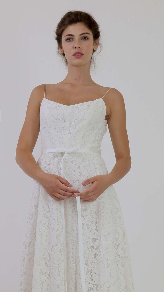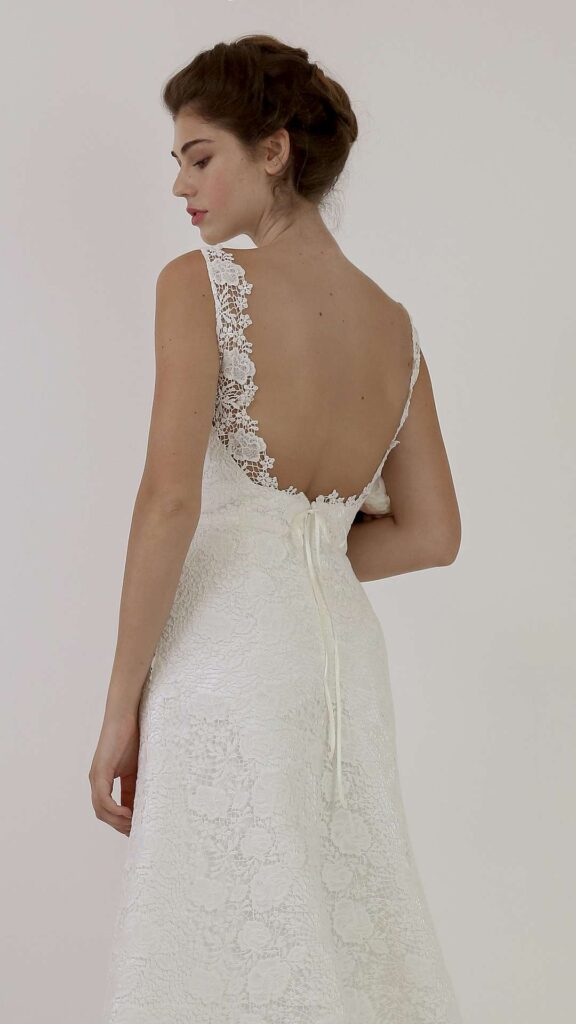 R. L’arte dell’uncinetto e del ricamo fanno parte del mio dna, lo vedevo fare alla mia bisnonna quando ero una bambina e per me è una lavorazione che vedo come assolutamente naturale ed estremamente raffinata per impreziosire un abito, più di strani effetti luccicanti. Un abito da sposa dalle linee morbide e contenute, con pochi, ma preziosi, dettagli lavorati a mano, è il massimo dell’eleganza e della modernità, per me.