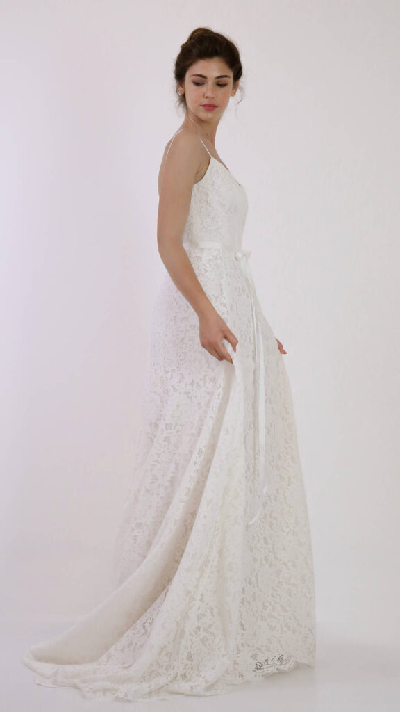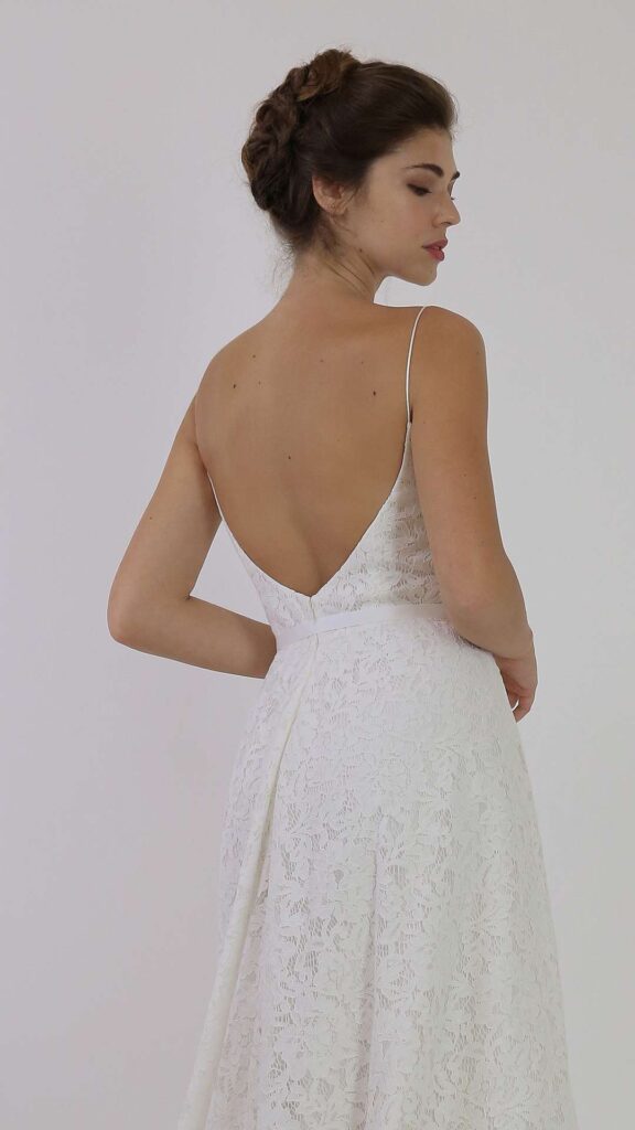 R. Sicuramente un abito More è costruito sulle diverse esigenze delle spose. Unicità è la parola d’ordine, ogni abito deve essere unico come ogni donna, impossibile pensare di vestire una sposa con abiti fatti in serie, standardizzati. Questo è quel plus a cui mi riferisco: portare l’alta sartoria al servizio delle spose. I miei abiti sono studiati per essere leggeri, portabili, dalla perfetta vestibilità. More è anche quel qualcosa in più che ti resta in testa, non deve necessariamente essere d’impatto, ma ti colpisce con discrezione.