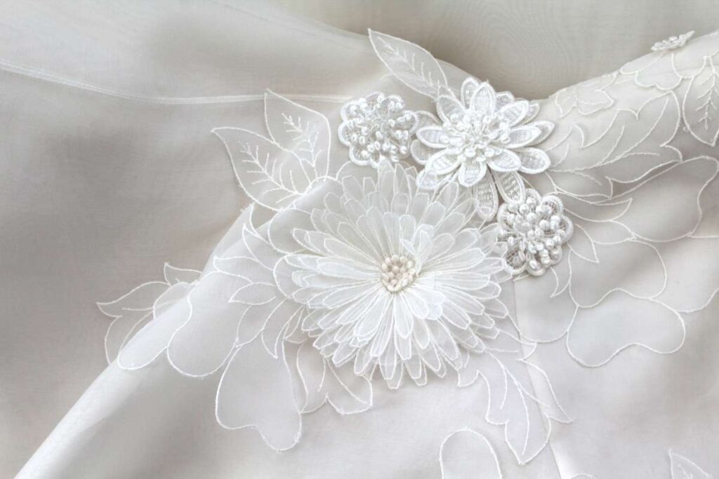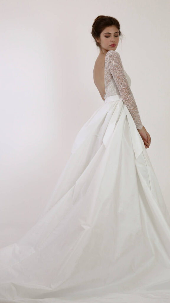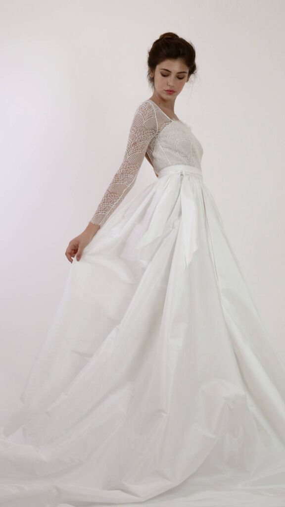 R. Spesso la scelta deriva da un amore a prima vista e poi su quel tipo di tessuto immagino e creo l’abito, altre volte è esattamente il contrario, ho un abito ben definito nella mia testa e devo trovare il tessuto giusto che ne definisca il carattere. La qualità di un tessuto, secondo me, non ha un valore solo estetico, ma anche di comfort e vestibilità. Ad esempio, tutti i miei abiti sono foderati in seta pura, proprio per dare alla sposa una sensazione di benessere addosso. Uso tanto sia i pizzi leggerissimi che quelli più corposi in cotone, nell’ultima collezione ho giocato molto con le trasparenze e le trame di alcuni tessuti, ma credo che il ricamo 3D floreale sia uno degli aspetti che contraddistingua maggiormente i miei abiti da sposa 2021. In generale credo che i tessuti di oggi devono accompagnare la silhouette della sposa e amo prevalentemente quelli leggeri e fluttuanti.