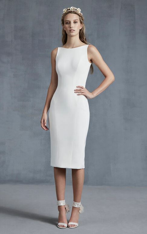 Tornando alla collezione sposa, ammiriamo abiti da sposa corti al ginocchio a tubino in crepe di seta con dettagli glamour, perfetti per nozze civili o informali.