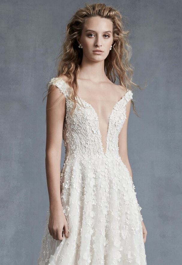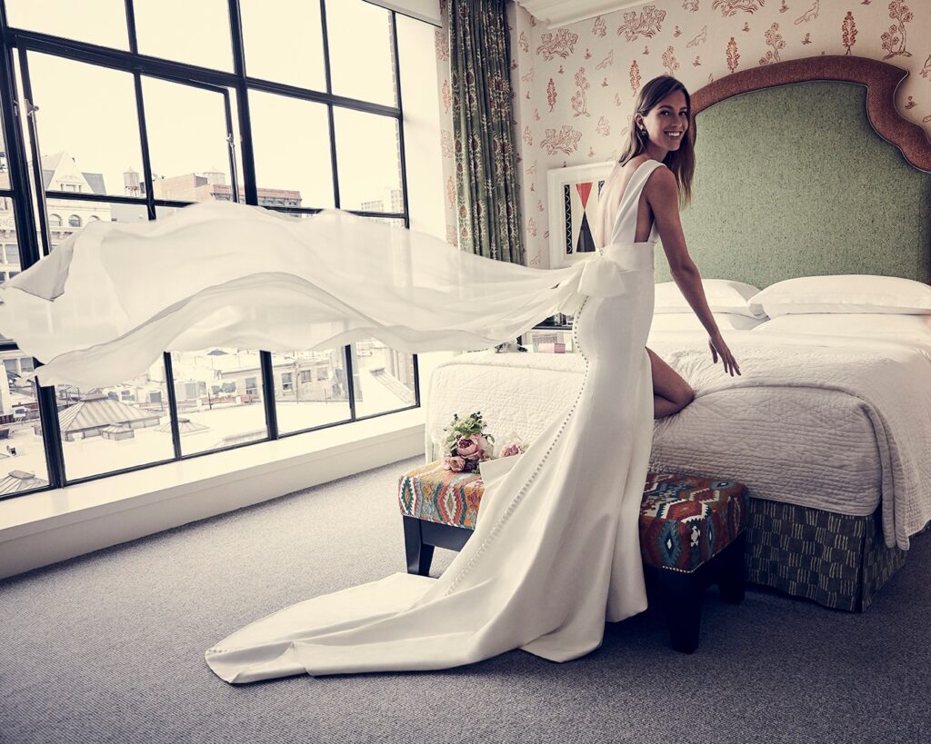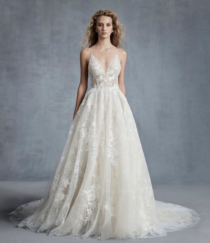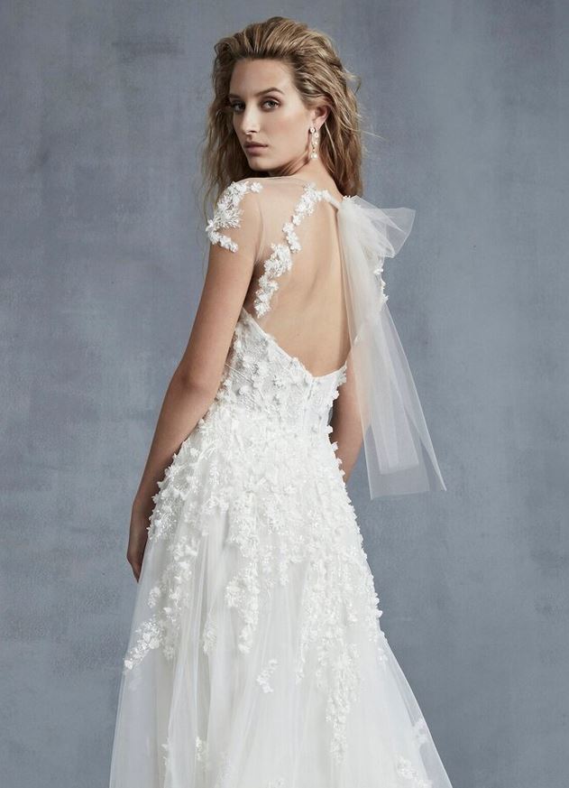 Simile a quest’ultimo, l’abito da sposa “Spellbound”, un modello A-line con scollatura totale, maniche a coppetta e scollo profondo a V sulla schiena, abbellito da micro ricami floreali.
