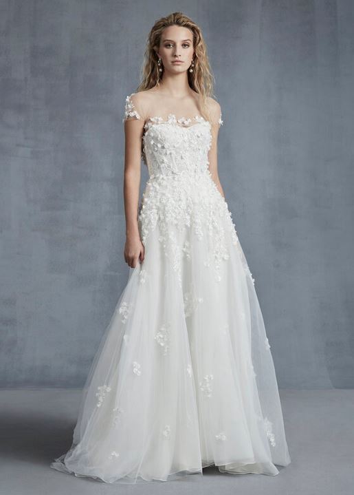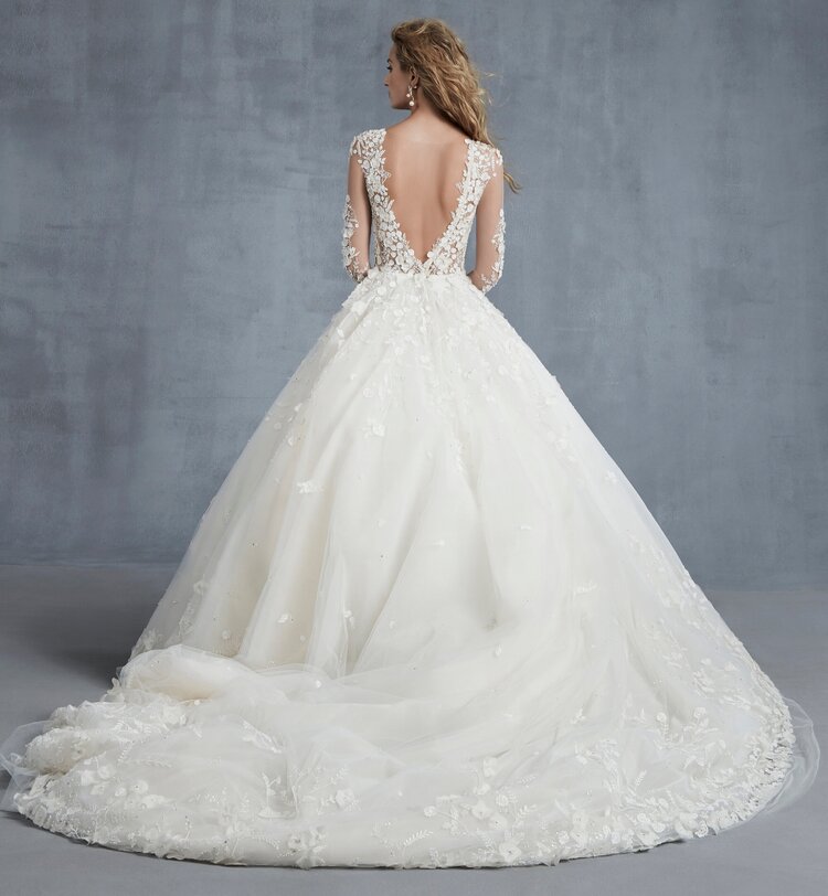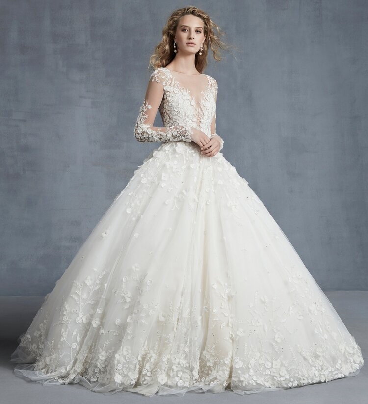 Un elemento tanto amato dalla stilista sono i fiori 3-D, che troviamo negli abiti “Cherish” – un modello A-line senza spalline abbinabile a bolero ricamato in tulle da chiudere sul retro -  e lo spettacolare ballgown “Majestic”, dalle maniche lunghe, con scollo velato e apertura a V sulla schiena.