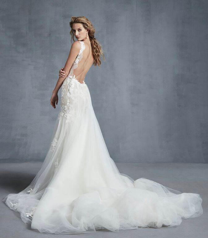 Ricami floreali anche per l’abito da sposa svasato “Desire”, dal corpetto velato, con scollatura profonda sul retro ed ampio strascico rimovibile.