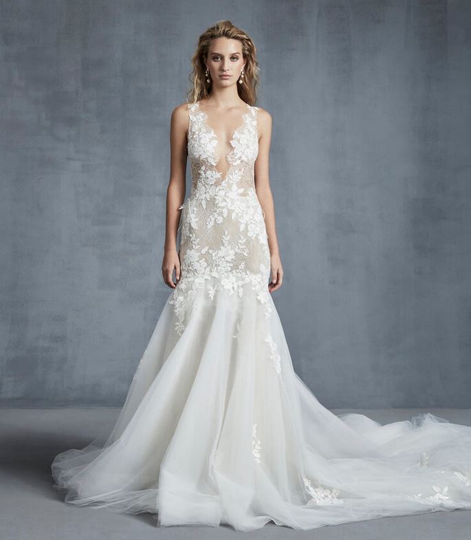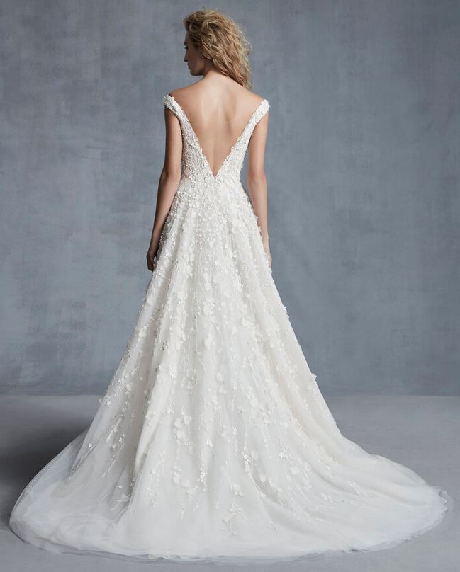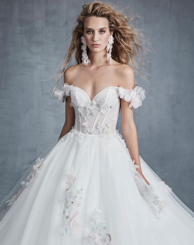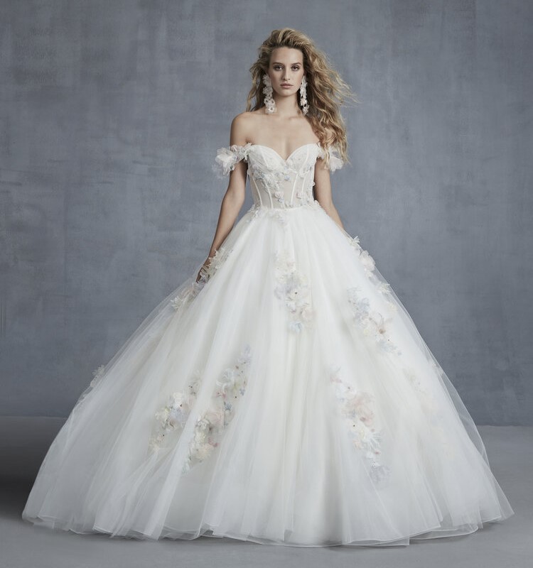 Davvero principesco l’abito da sposa “Embrace”, un ballgown in tulle con scollatura off-the-shoulder e maniche a coppetta, corsetto con ampia apertura sulla schiena; l’abito è abbellito da applicazioni floreali nei toni pastello, applicati a cascata.