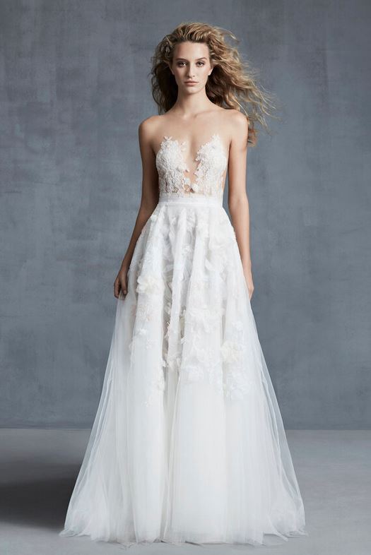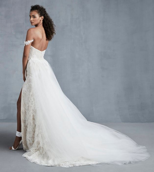 Più romantico l’abito da sposa “Honor”, un modello abbellito da applicazioni in pizzo sul corpetto velato, abbinato a maniche a palloncino staccabili.