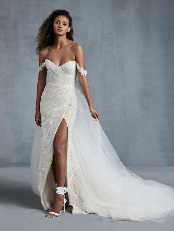Sensuale e glam l’abito da sposa “Love-struck”, in tulle e pizzo, perfetto come secondo abito da sposa per il party nuziale, un modello a tubino con scollo a cuore e ampio spacco.