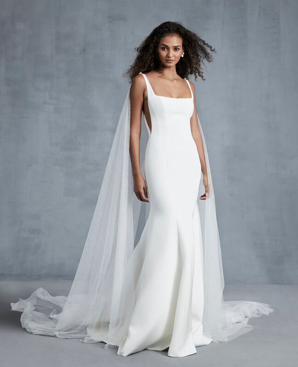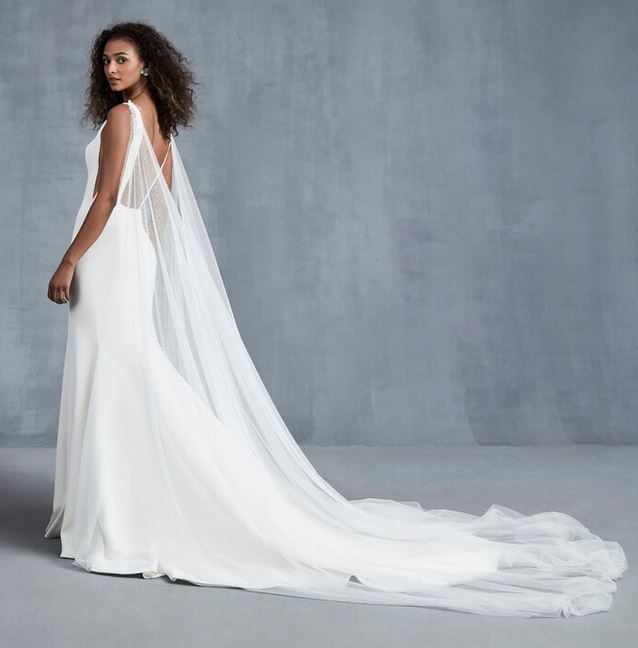 Per l’ultimo modello a tubino, con scollo quadrato e apertura laterali sui fianchi, effetto spettacolare grazie alla mantella da sposa rimovibile che dà un effetto davvero “celestiale”, come descrive il brand.