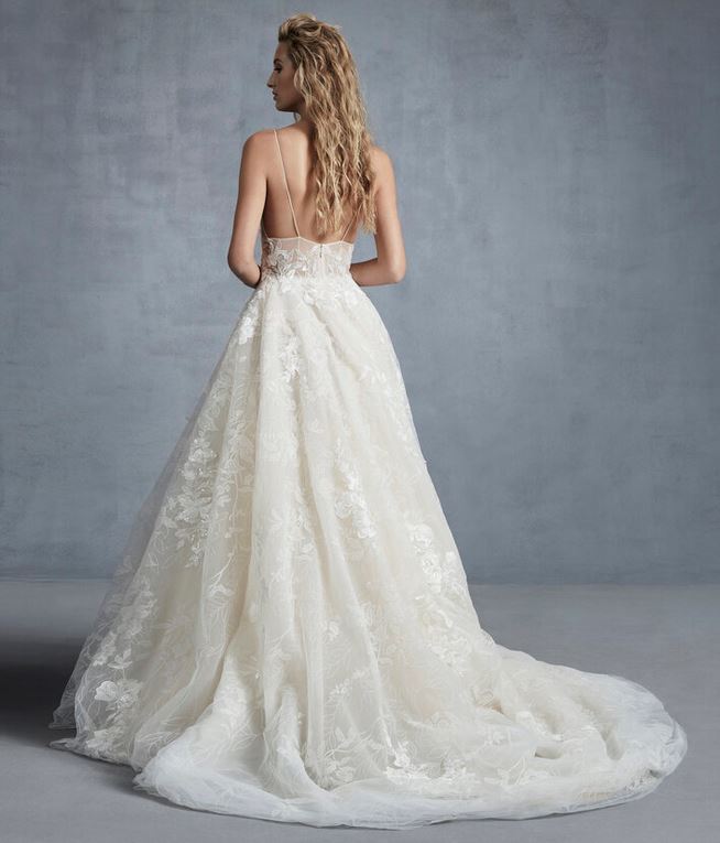 Delicati i dettagli floreali dell’abito da sposa “Wish”, un ball gown con corpetto lingerie dalle spalline sottili e profonda apertura sul retro.