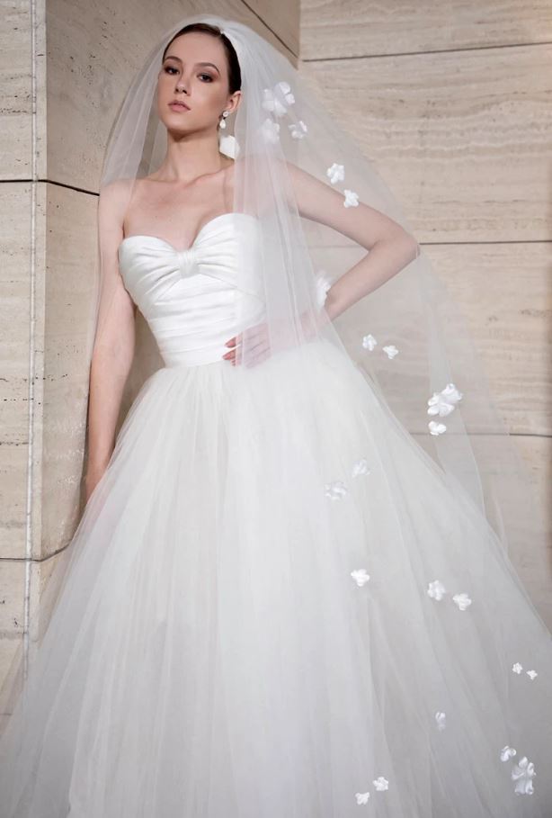 Particolare anche il corpetto con scollo a cuore del ball gown in tulle con drappeggi, abbinato ad un ampio velo in tulle con deliziosi fiori 3D applicati a cascata.