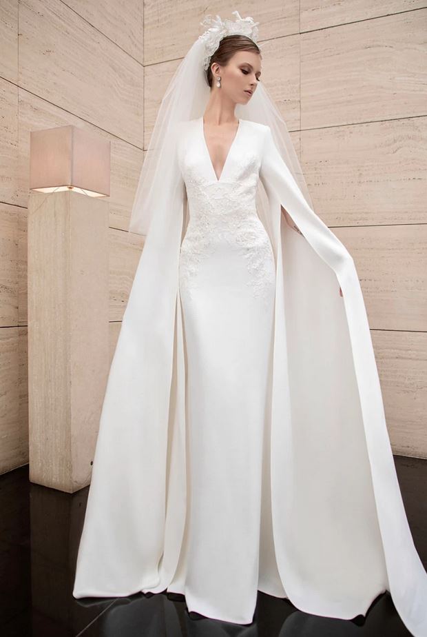 Per la sposa che ama le linee pulite, perfetto l’abito da sposa a tubino in crepe di seta con ricami in vita e super glam maniche a mantella; l’abito è proposto in abbinamento ad un velo da sposa corto.