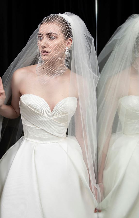 Molto interessanti le plissettature sul corpetto con scollo a cuore del ball gown in satin di seta abbinato a velo e veletta da sposa a rete, un abbinamento decisamente audace.