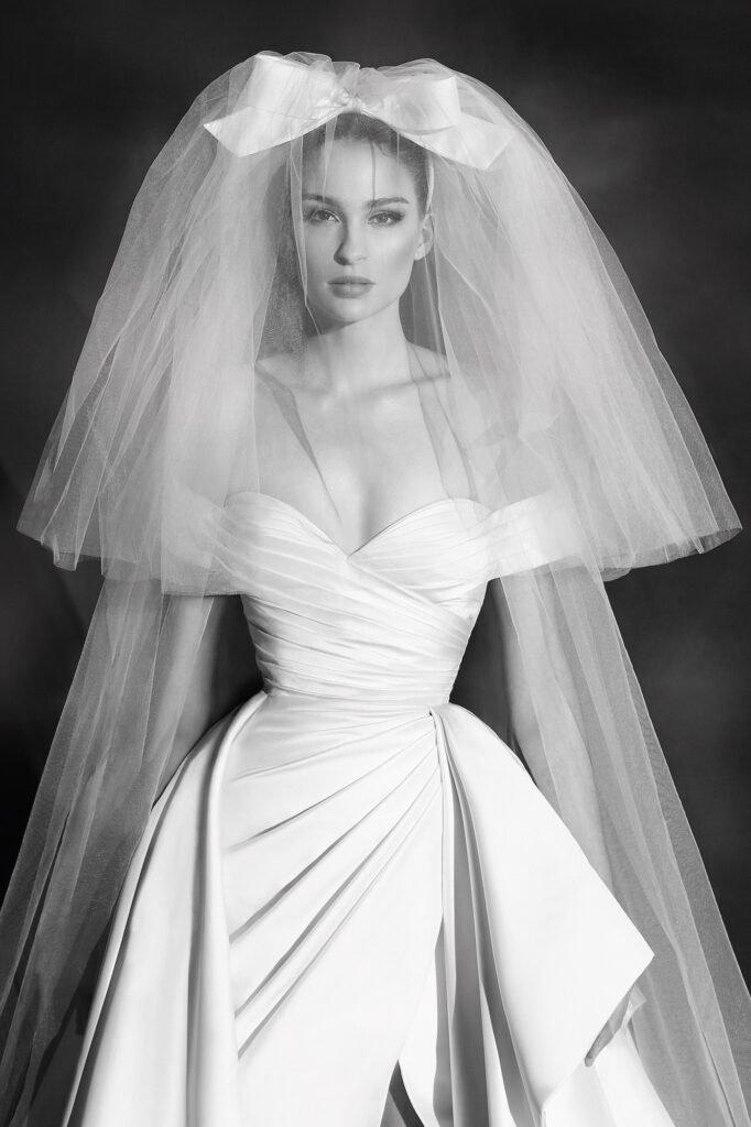 Un’ispirazione che notiamo subito nel primo abito, un ball gown a corsetto in mikado dal poetico romanticismo, proposto in abbinamento ad un civettuolo cerchietto con fiocco e, per chi desidera aggiungo un tocco tradizionale, ad un lungo velo con “blusher”, ossia la parte che ricade davanti per coprire il viso (vedi il nostro approfondimento sul velo da sposa).