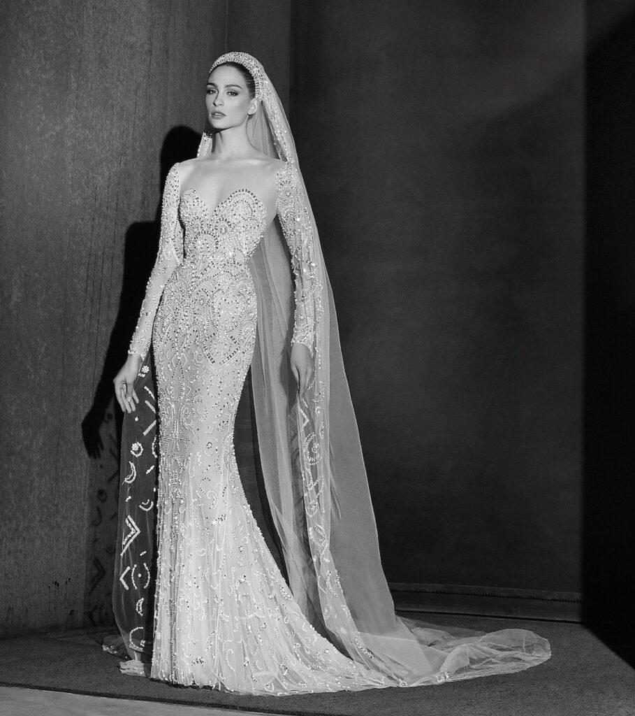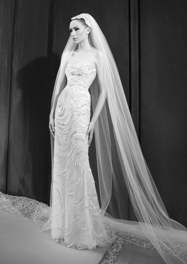 L’abito da sposa a colonna con ricami scintillanti a onda, può essere arricchito da una sopragonna e abbinato da un ampio velo con cuffietta che ricorda molto l’abito da sposa di Grace Kelly.