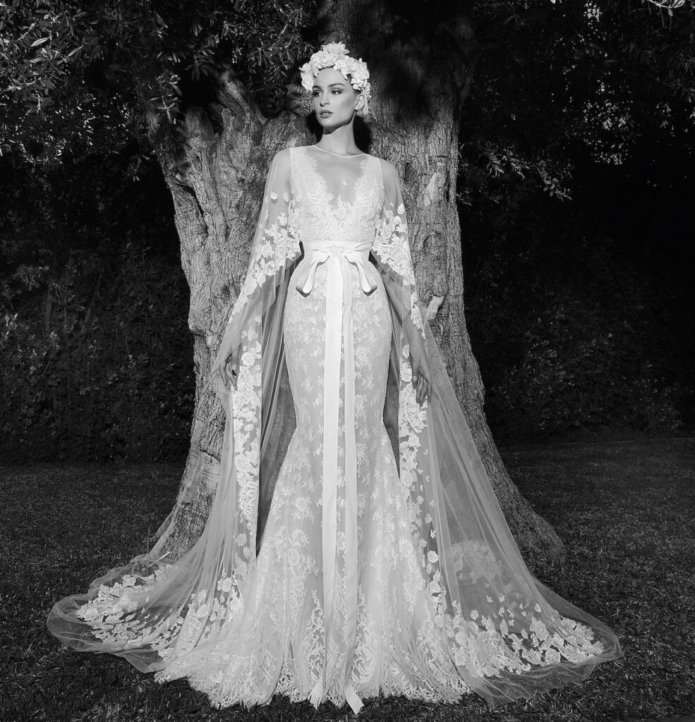 abito da sposa in pizzo con mantella Zuhair Murad Spring 2022