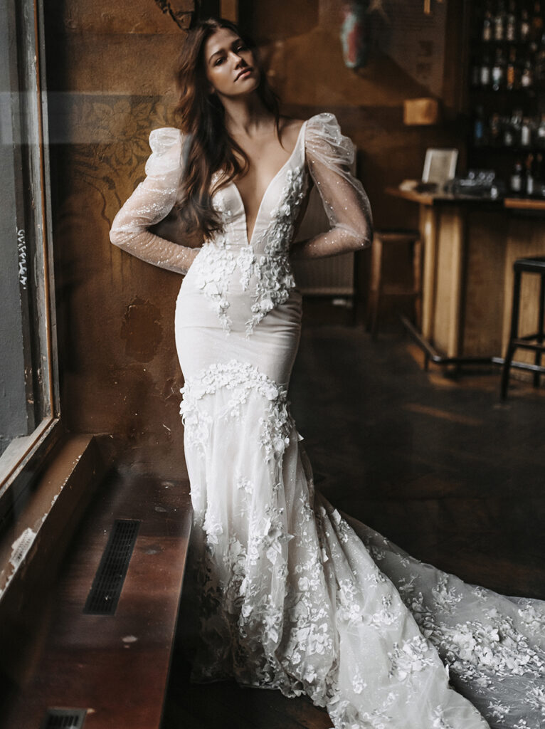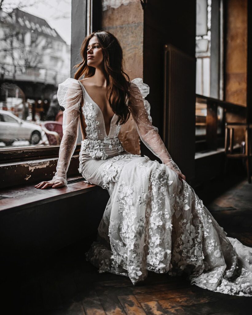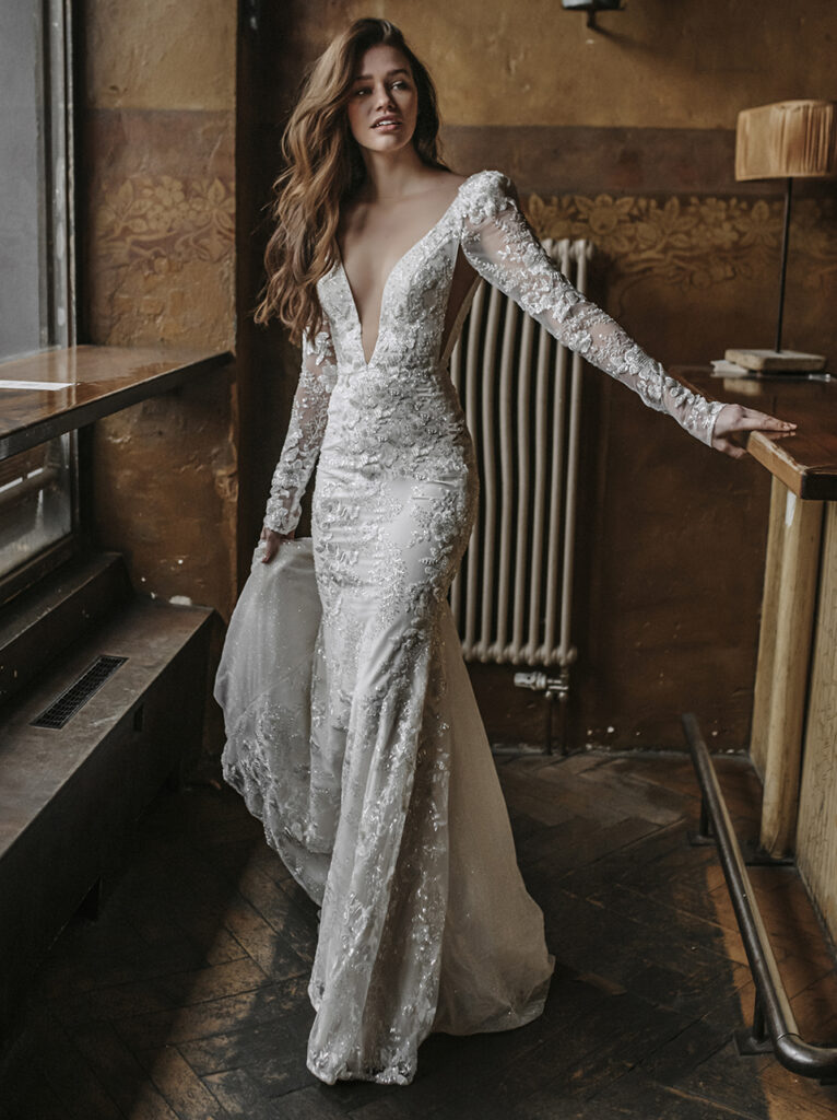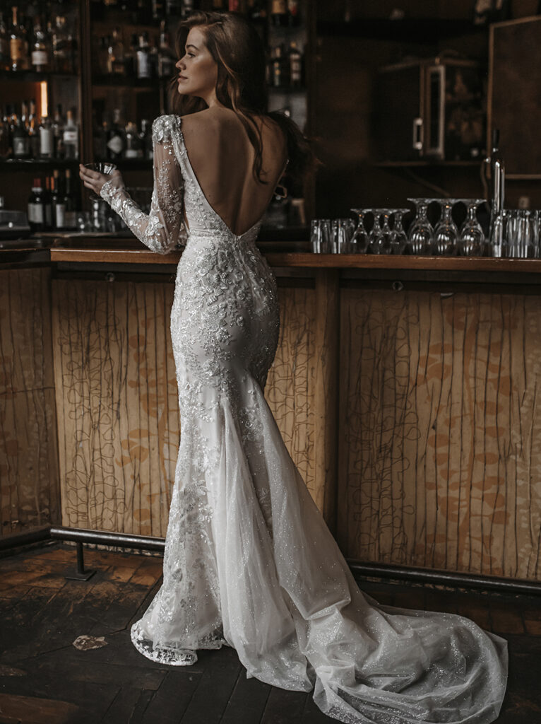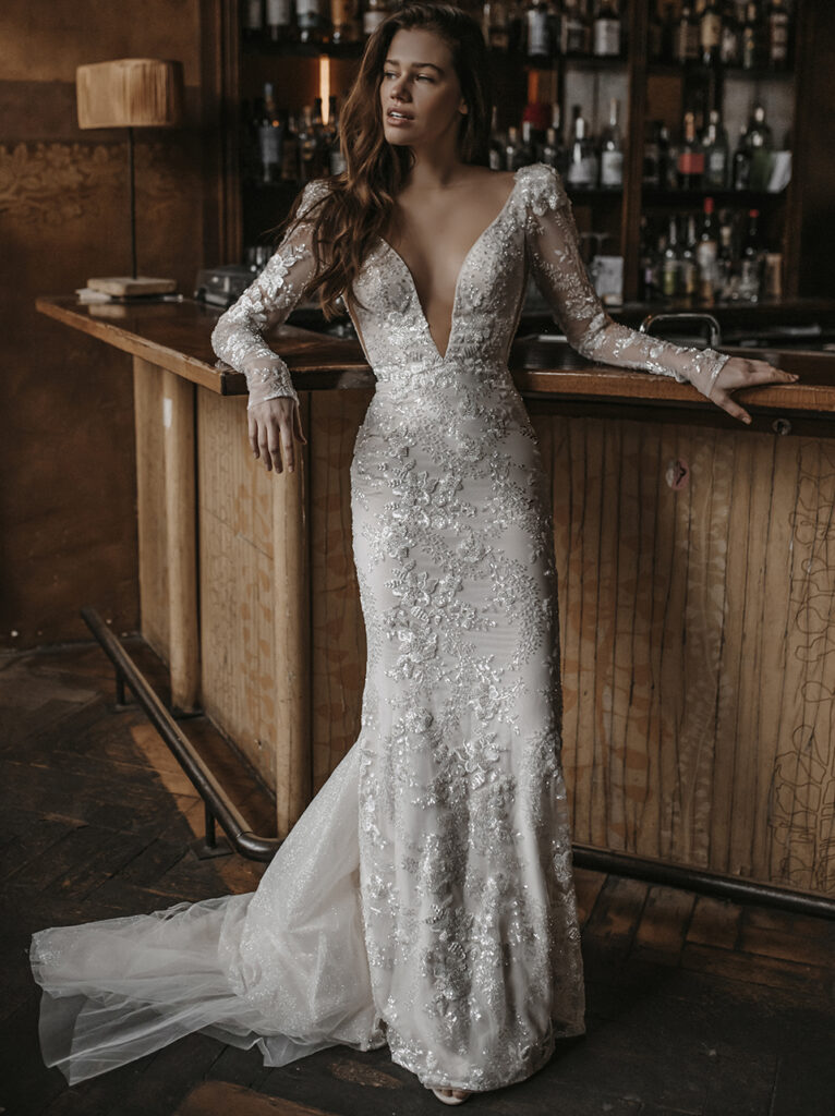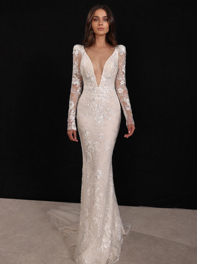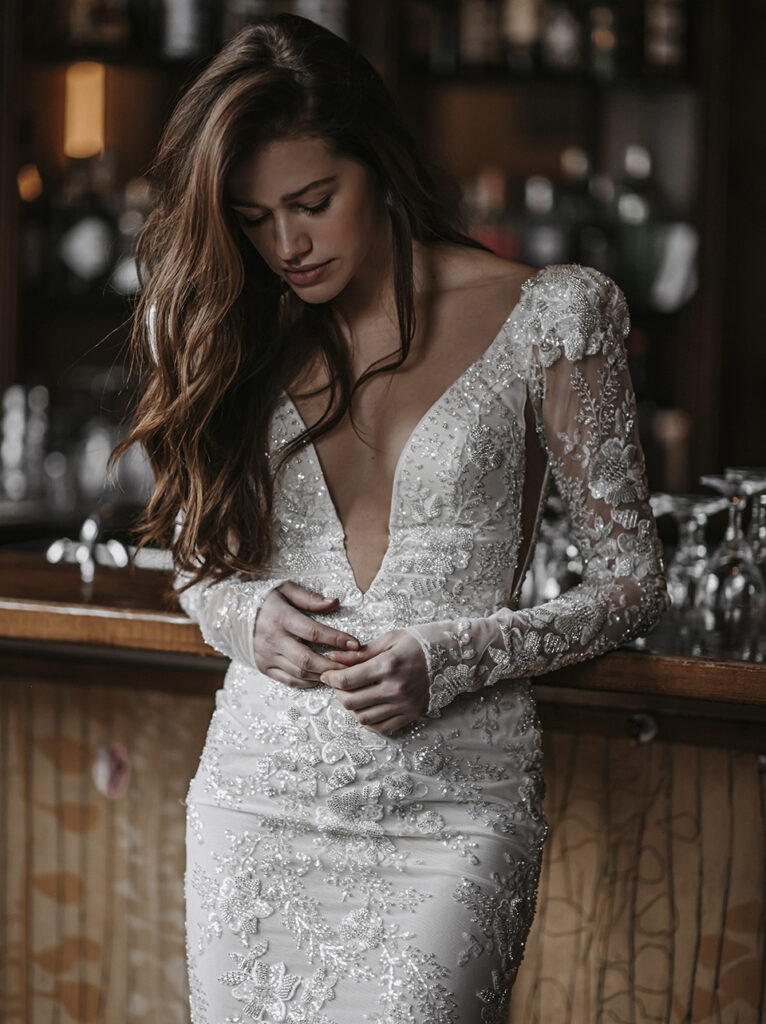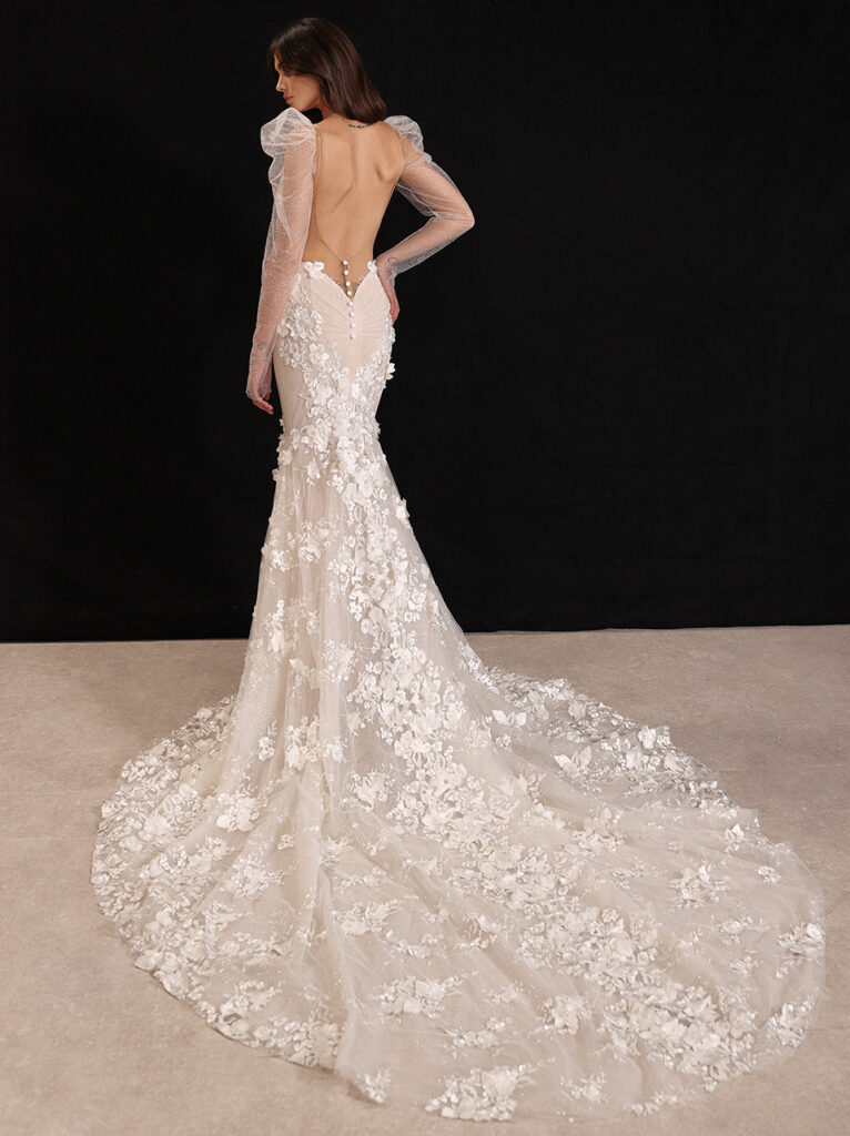 Altrettanto particolare e audace è “Paz”, un seducente abito da sposa con scollo a V, sexy ma sofisticato se abbinato a spalle imbottite su misura e maniche lunghe aderenti coperte di pizzo con perline floreali scintillanti in tonalità di avorio caldo e argento con tulle scintillante, ampio strascico di lunghezza cappella.