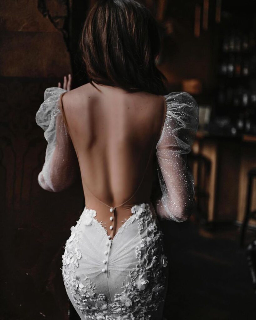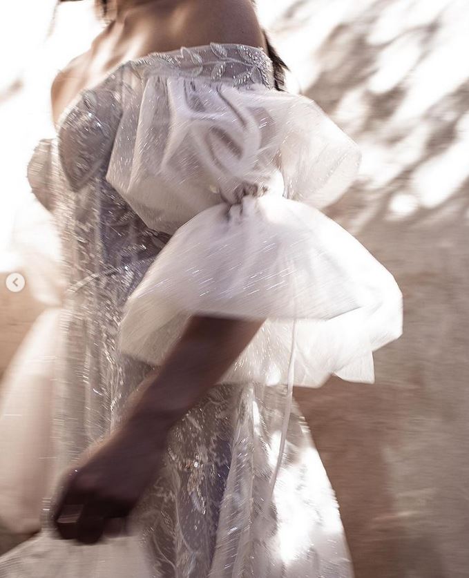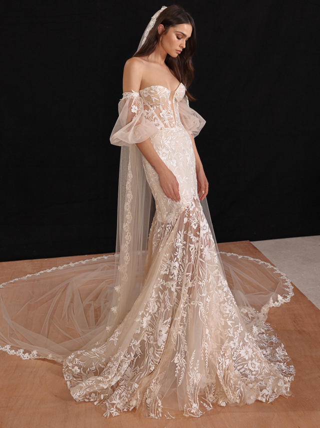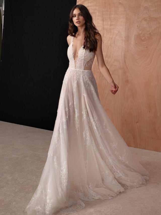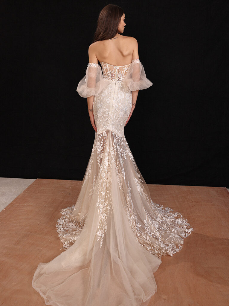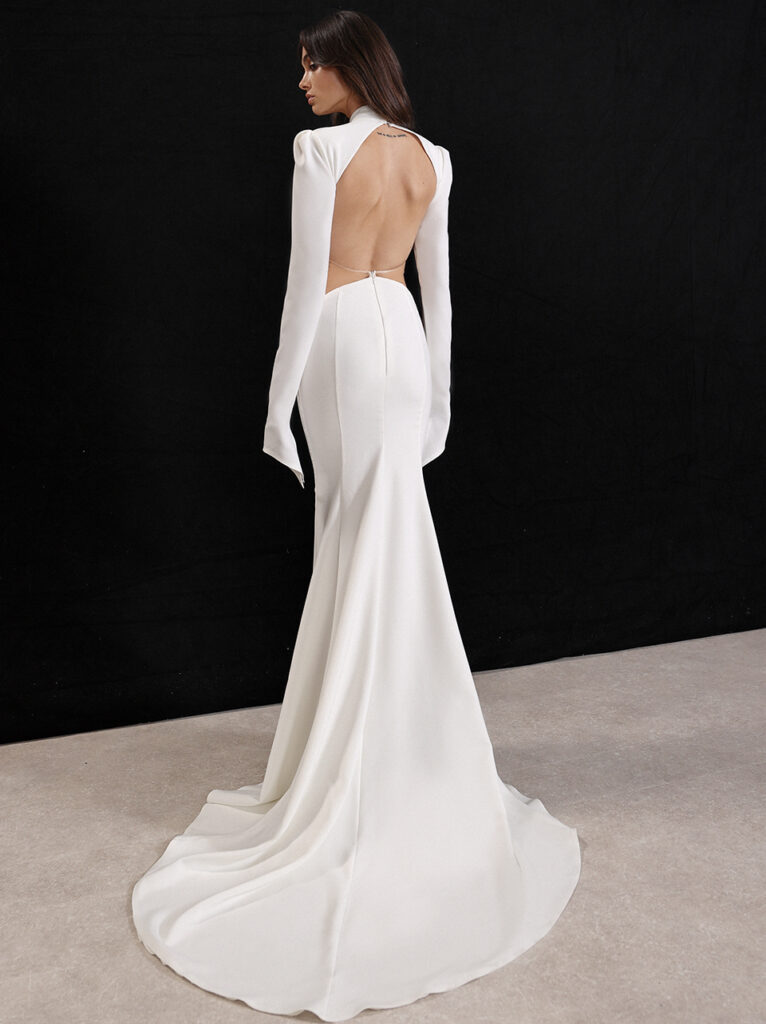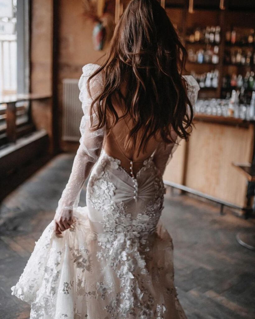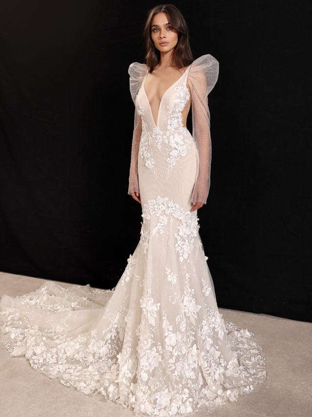 Altrettanto particolare e audace è “Paz”, un seducente abito da sposa con scollo a V, sexy ma sofisticato se abbinato a spalle imbottite su misura e maniche lunghe aderenti coperte di pizzo con perline floreali scintillanti in tonalità di avorio caldo e argento con tulle scintillante, ampio strascico di lunghezza cappella.