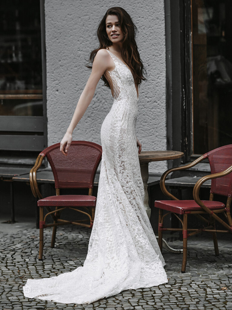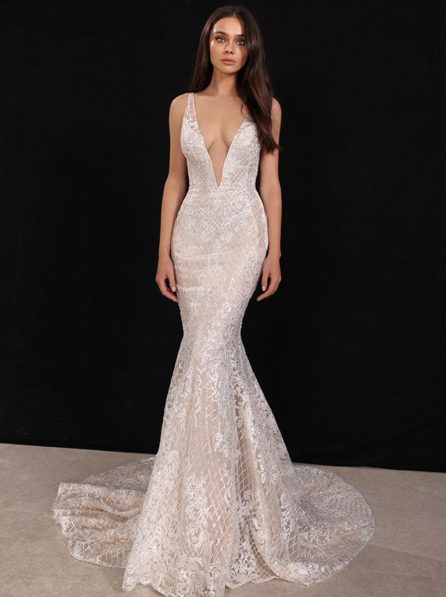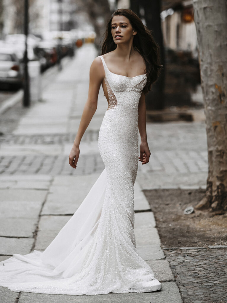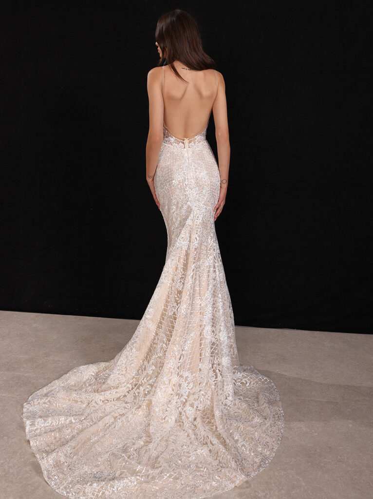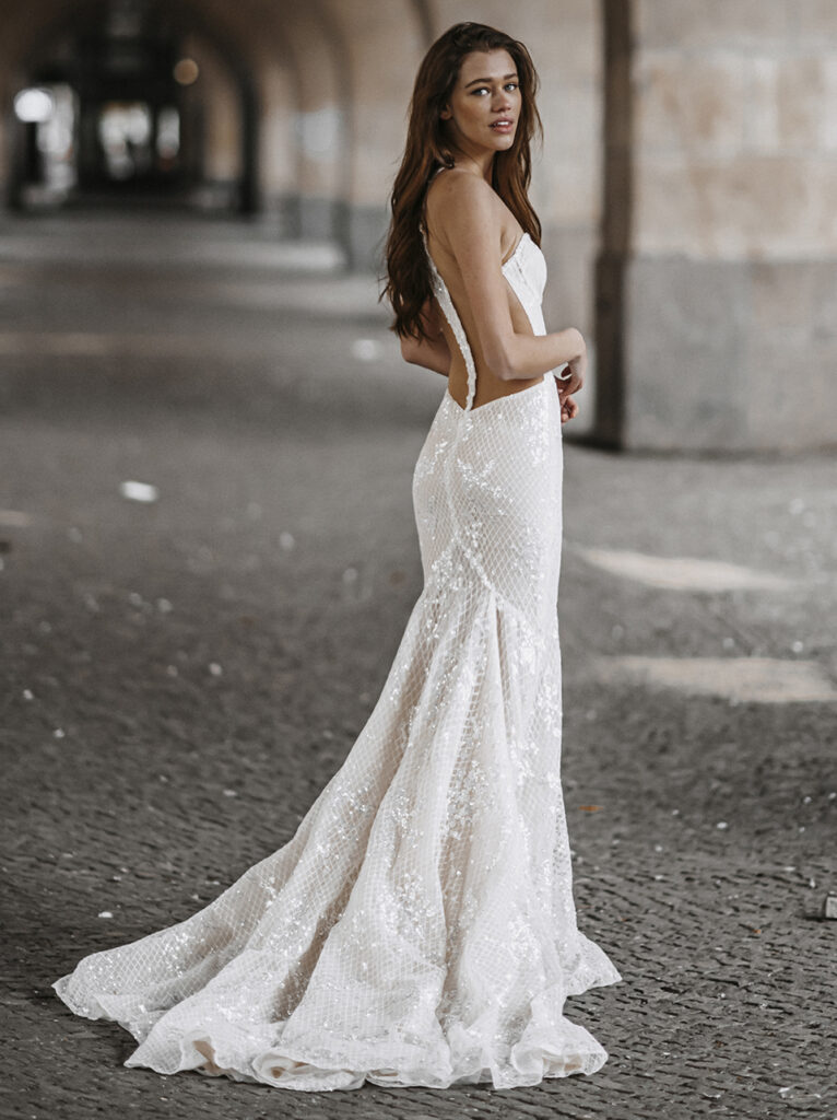Per la sposa super glam e come secondo abito per il party nuziale, non mancano le proposte come “Vic”, abito da sposa a sirena aderente realizzato in lussuoso pizzo di paillettes in un moderno motivo geometrico per un look elegante, chic e lucente evidenziato da un basso scollo a V, pannelli laterali trasparenti e un ampio strascico a cappella.