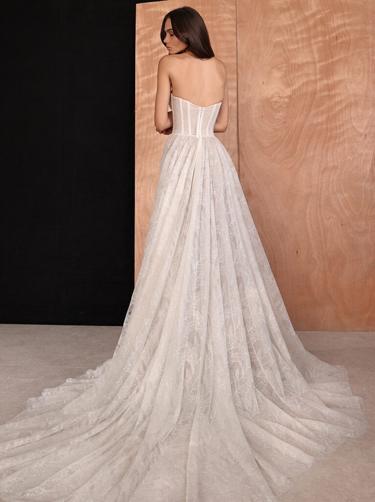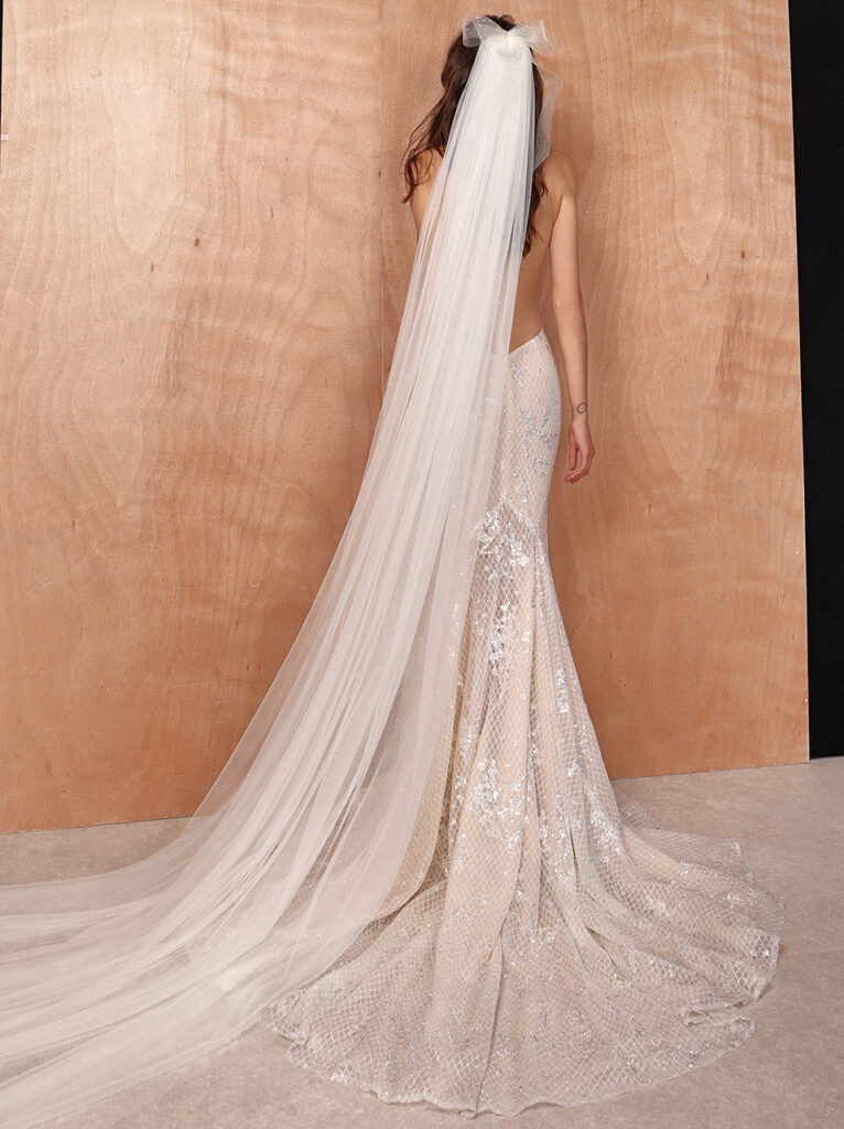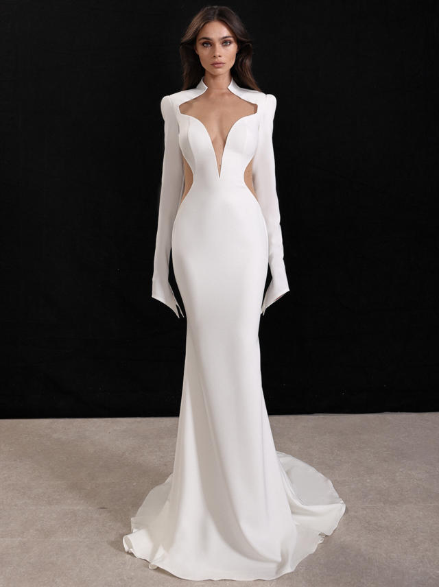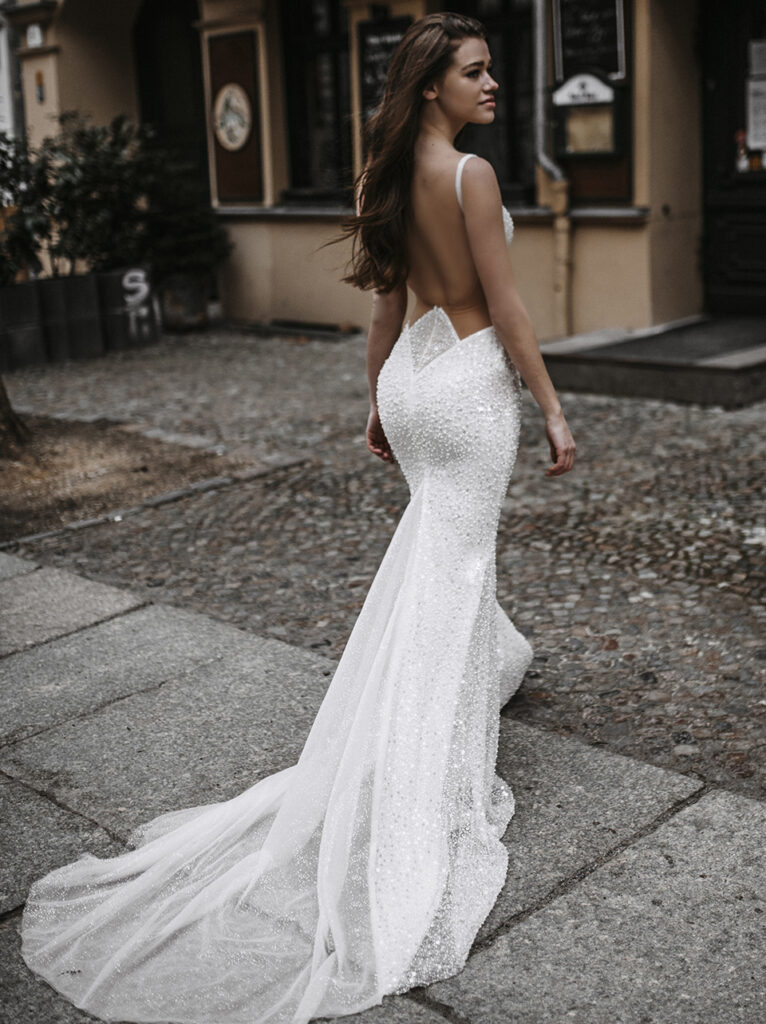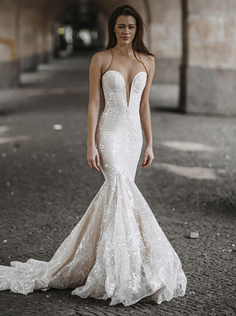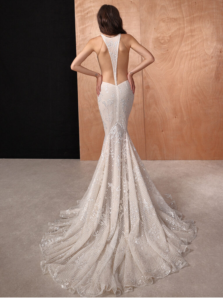Per la sposa super glam e come secondo abito per il party nuziale, non mancano le proposte come “Vic”, abito da sposa a sirena aderente realizzato in lussuoso pizzo di paillettes in un moderno motivo geometrico per un look elegante, chic e lucente evidenziato da un basso scollo a V, pannelli laterali trasparenti e un ampio strascico a cappella.