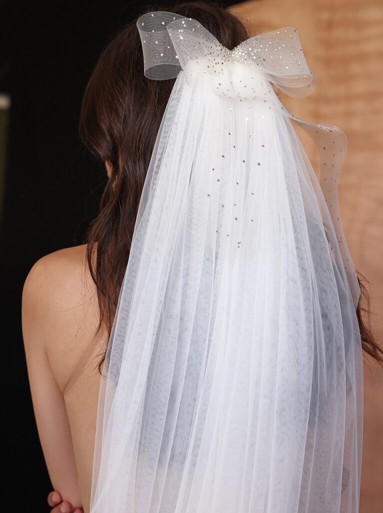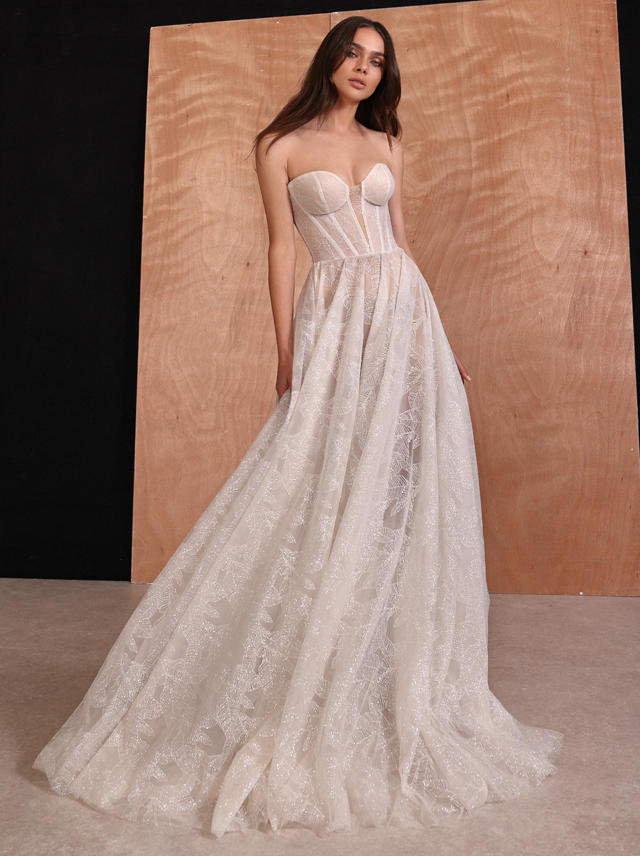 I tessuti preziosi comprendono pizzo guipure, raso lucente, crepe di seta con dettagli quali paillettes abbaglianti anche sul velo da sposa, perline, tagli che lasciano intravedere la pelle e luccichii metallici.
