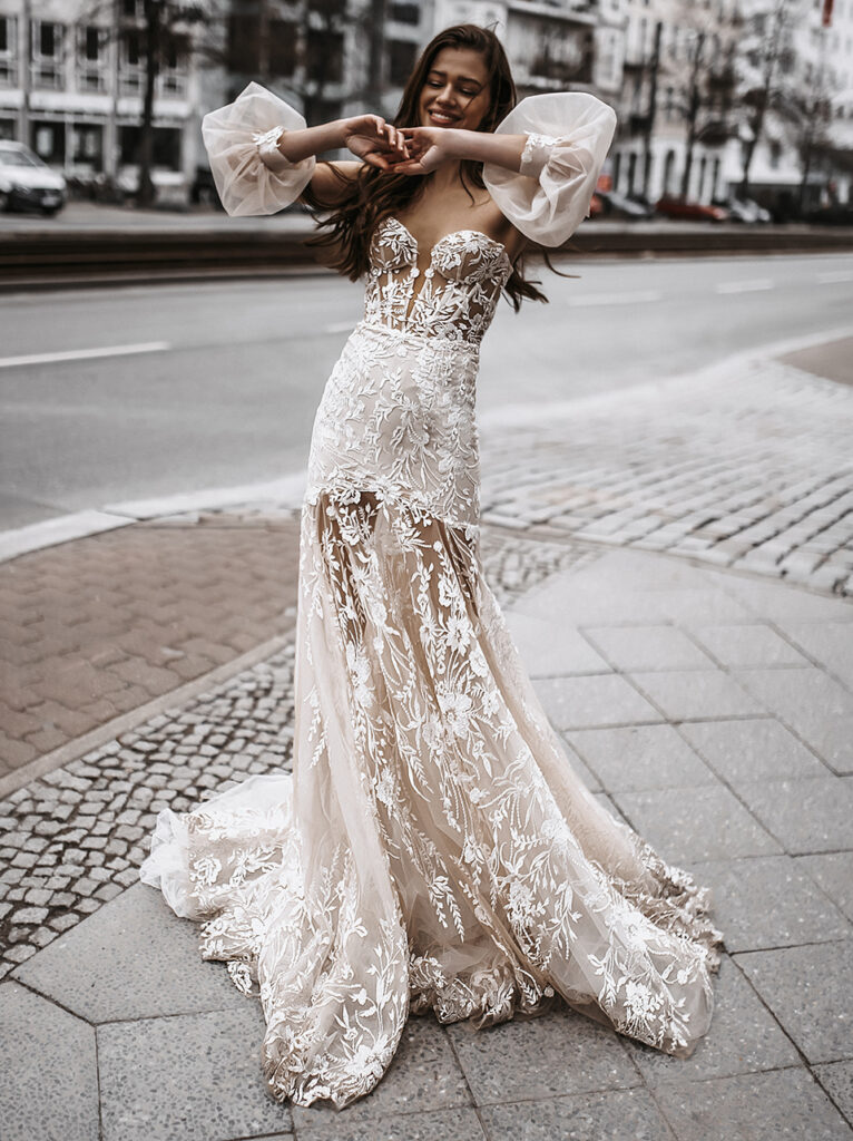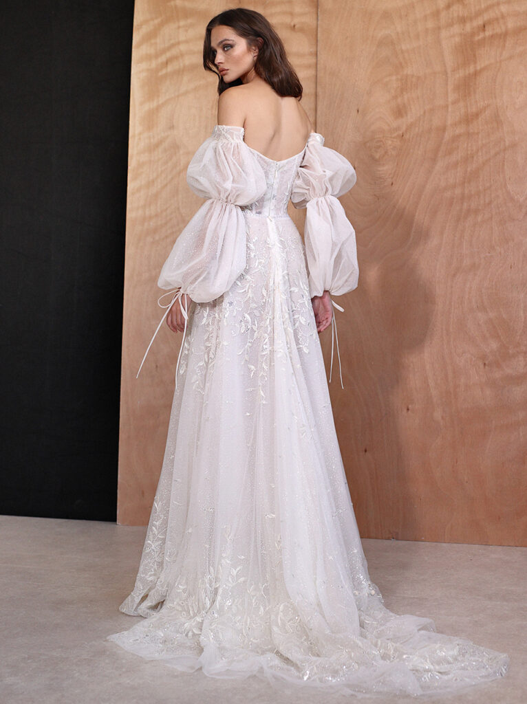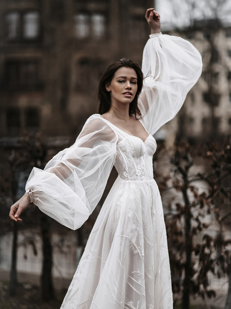 In questa collezione, numerosi e diversi nelle slihouette sono gli abiti da sposa con maniche romantiche, lunghe o corte, a palloncino, anche rimovibili.