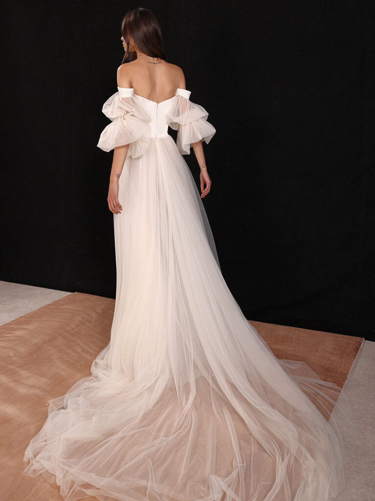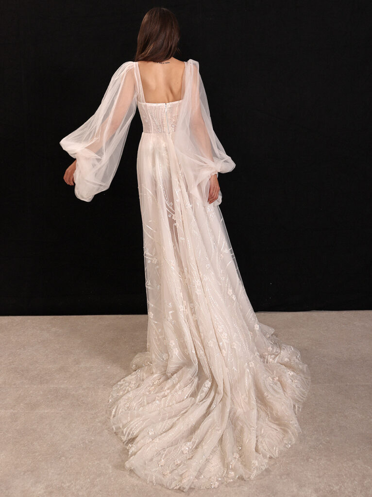 Perfetto abito da sposa boho-chic il modello “Josi”, un modello svasato in tulle abbellito da ricami a foglia, con corsetto e gonna velati, scollo totale e deliziose maniche corte a palloncino.