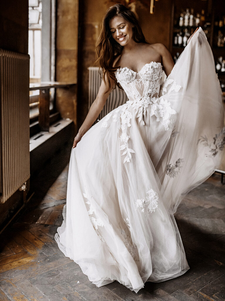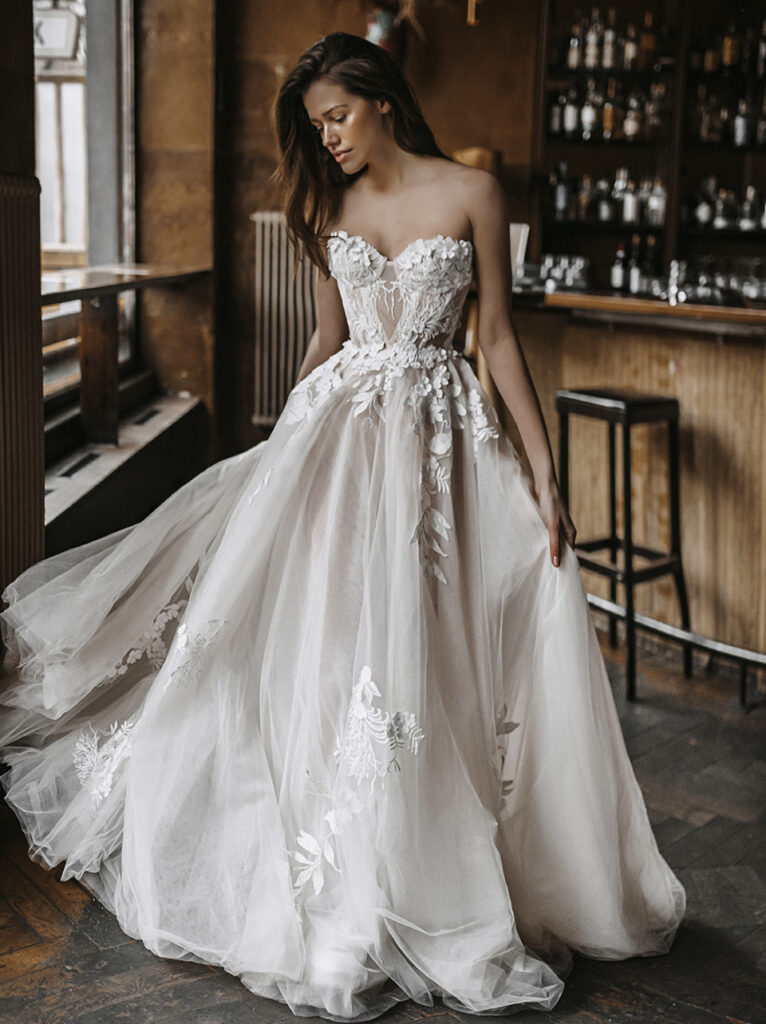 L’abito corsetto “Indie” A-line ha delicato dettagli floreali, applicazioni di petali color cipria e a foglia, grandi maniche a palloncino per un look super glam.