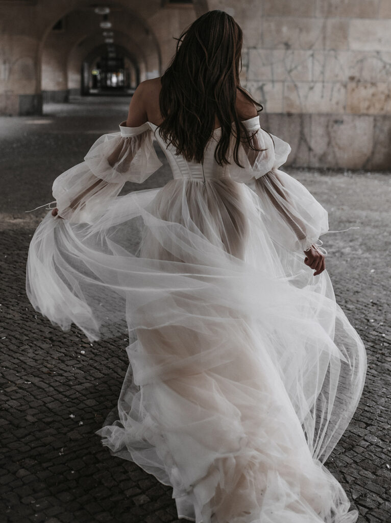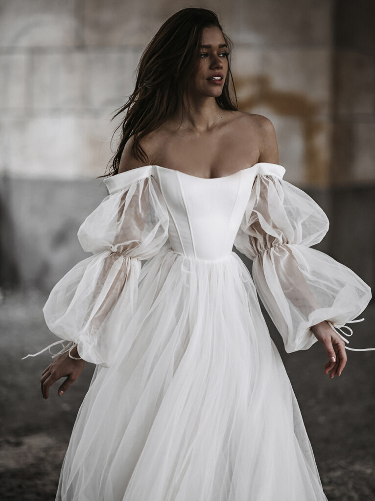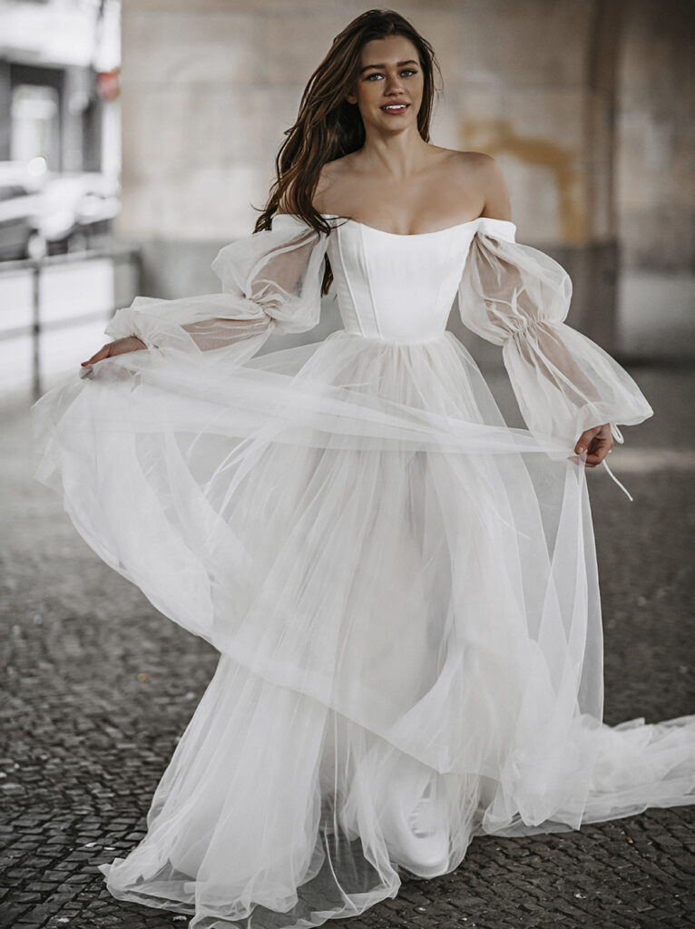 Gli abiti da sposa “Mel” e “Mimi” sono due ball gown con scollatura totale, il secondo con corsetto in satin, impreziositi da ricami e con grandi maniche a palloncino.