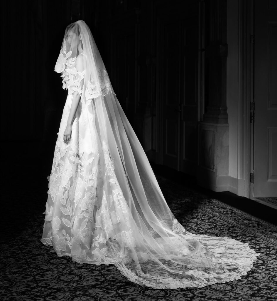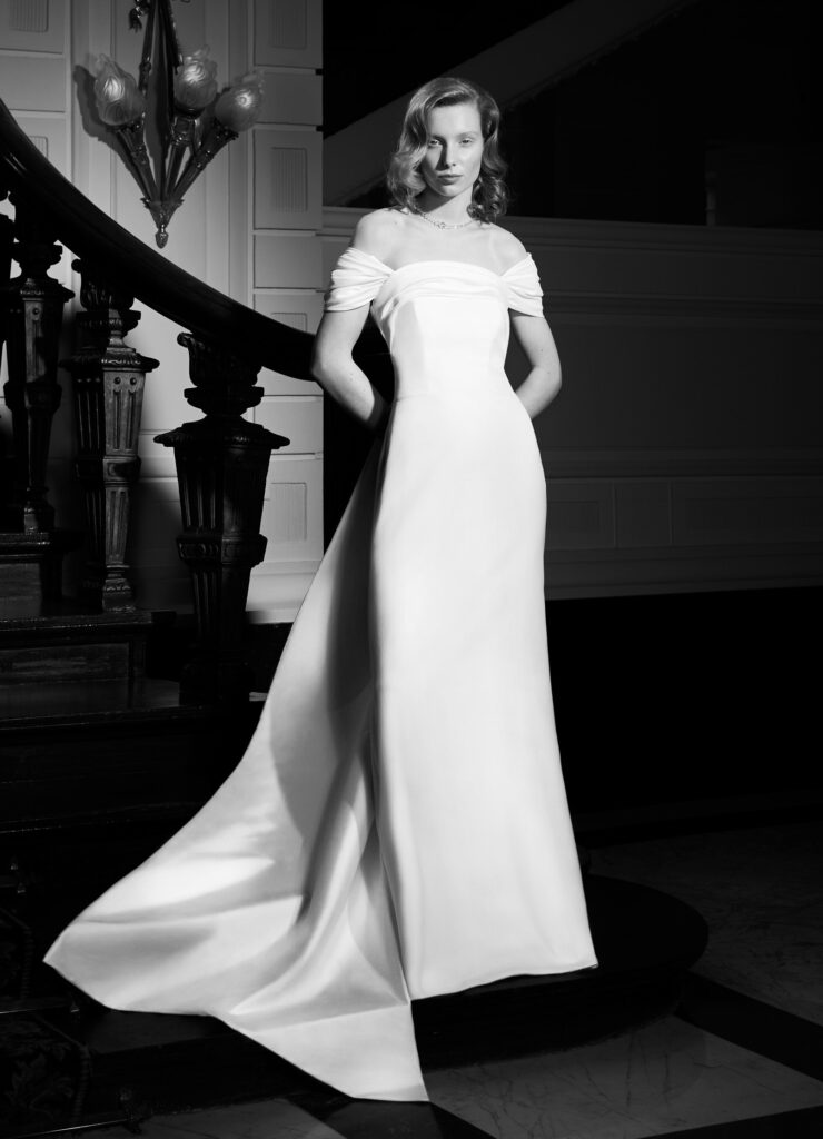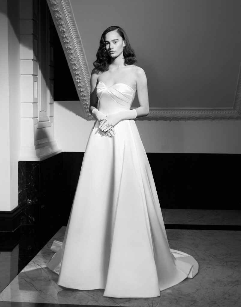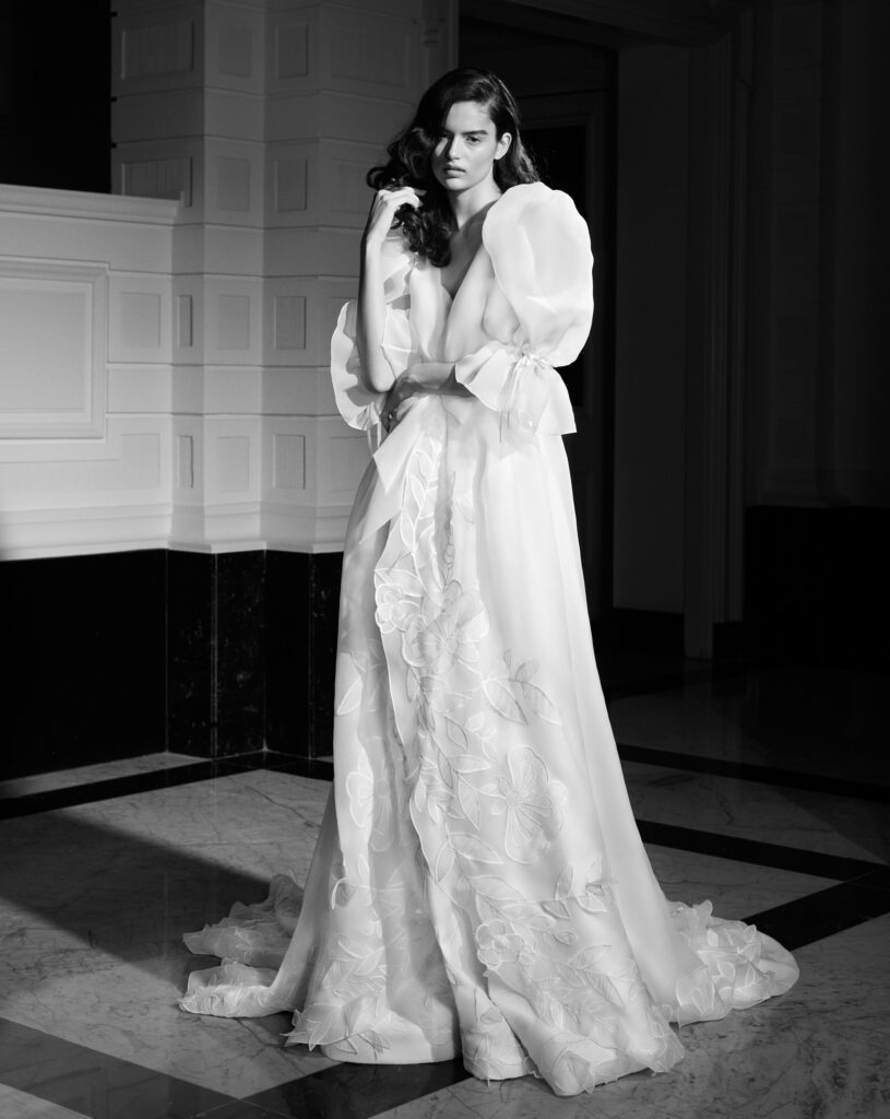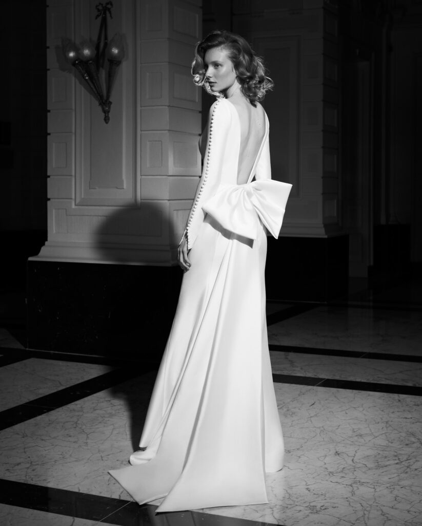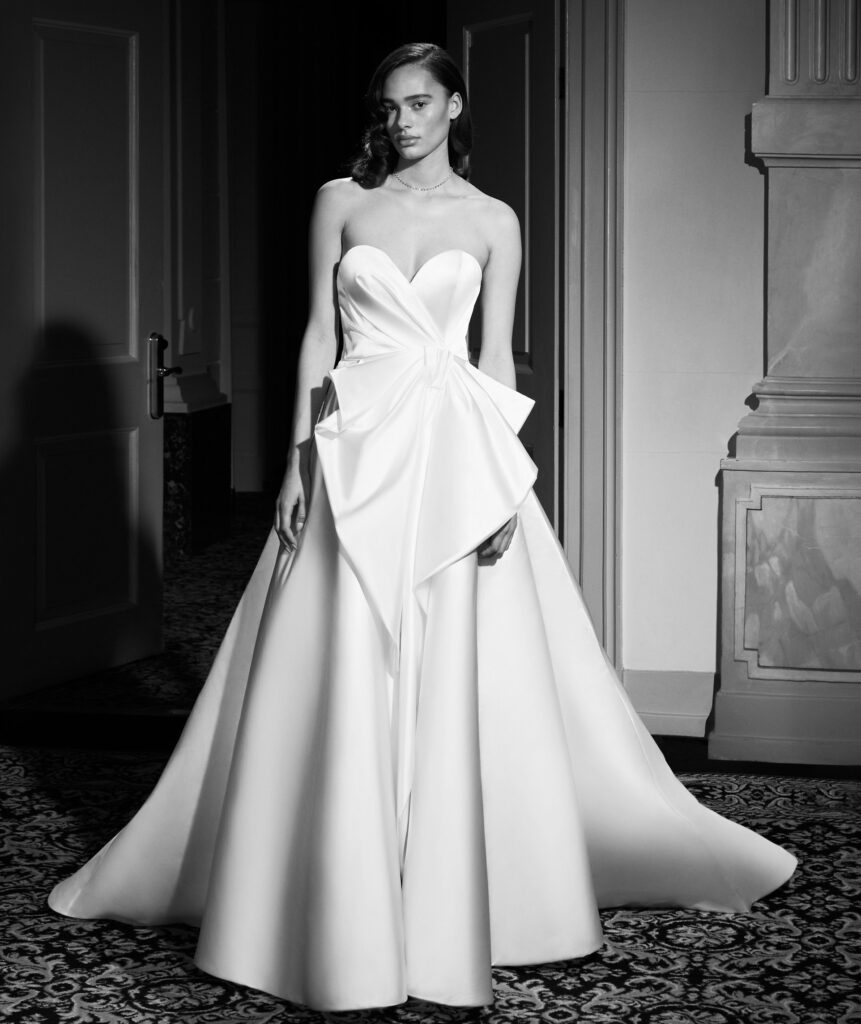 Super glam l’abbinamento della mantella da sposa in mikado dalle maniche scultura a sbuffo, con l’abito da sposa a sirena in mini-jacquard con bustier senza spalline e spacco. In vita, la cintura di raso drappeggiata avvolge la schiena e si trasforma in un elaborato fiocco, elemento signature del brand. Il fiocco di raso e le spalline scendono a cascata lungo il sontuoso strascico.