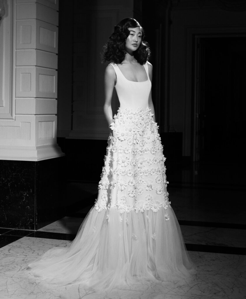 Chic l’abito A-line realizzato in crêpe opaco double-face, con una morbida scollatura quadrata, schiena rotonda e grazioso strascico. Margherite di raso anni '60 lavorate a mano e decorate con centri ricamati in cristallo trasparente, si spargono lungo l'abito e si posano sull'orlo, che presenta dei volant realizzati in tulle e organza.