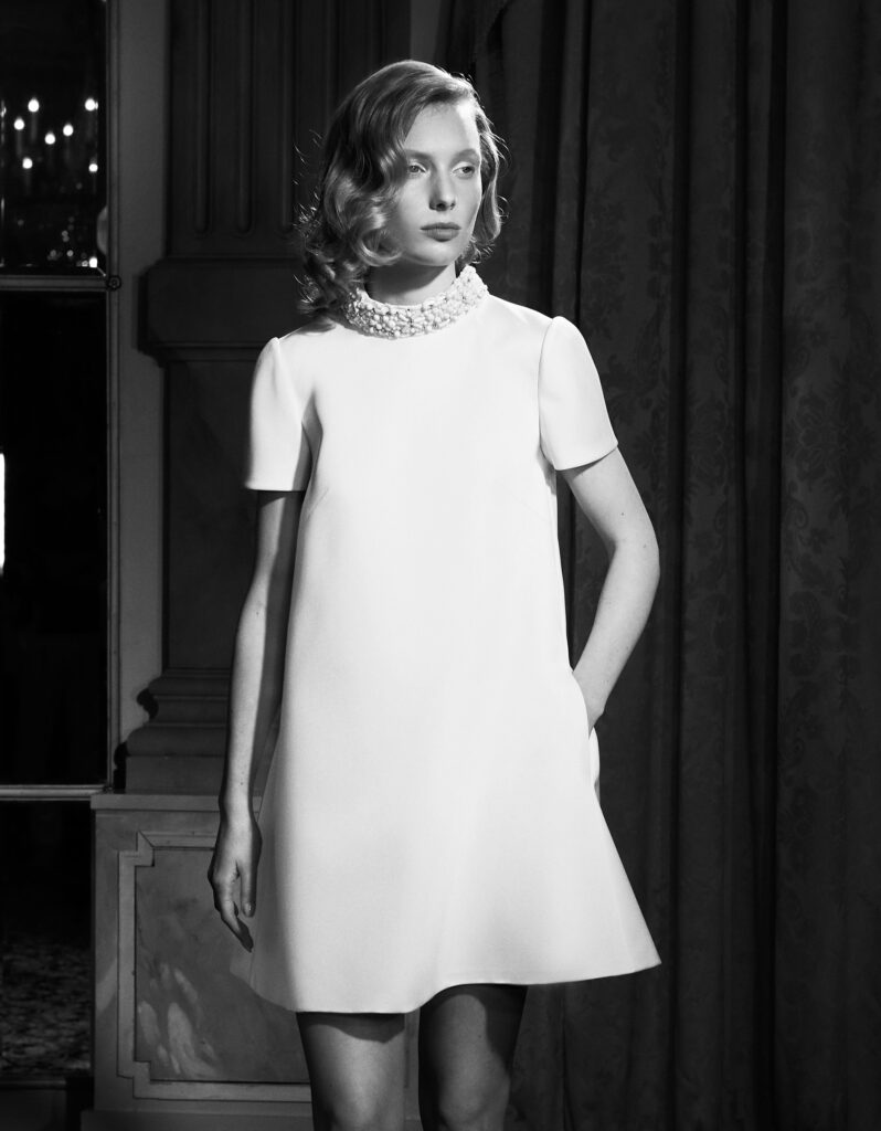 Gusto anni ’60 anche per l’abito da sposa corto in lucido crêpe double-face, caratterizzato da maniche corte a maglietta, tasche e scollatura alta con una delicata fascia ricamata sul collo che si trasforma in un'apertura a fessura ricamata sul retro con piccoli dettagli a forma di fiocco.