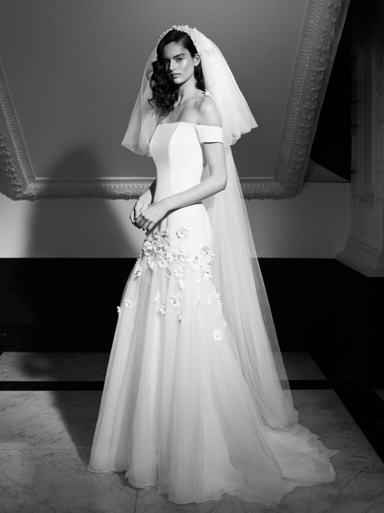 Davvero chic l’abito a sirena con scollatura off-the-shoulder, realizzato in crêpe con una leggera elasticità che permette al vestito di modellarsi perfettamente al corpo. L'interesse per la schiena è creato da un seducente taglio aperto sul retro che lascia spazio a bottoni ricoperti di tessuto. Margherite in raso anni '60 decorate a mano con centri ricamati in cristalli trasparenti si spargono lungo l'abito e si posano sui volant trasparenti, realizzati in tulle e organza e che si svasano in un grazioso strascico. L’abito è proposto in abbinamento ad un velo in tulle dallo strato corto soffiato, con una fascia ornata da margherite di raso anni '60 fatte a mano e decorate con centri ricamati con cristalli trasparenti, che lascia spazio ad uno strascico scenografico.