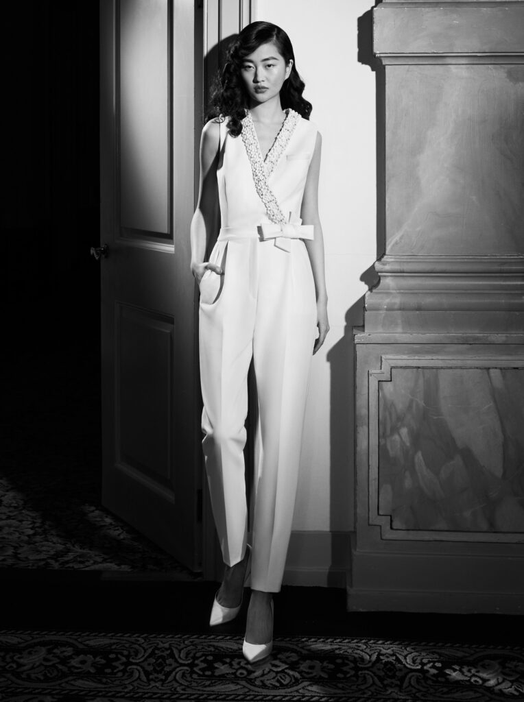 Presente nella collezione anche una bellissima tuta da sposa, realizzata in crêpe leggermente elasticizzato, con scollatura incrociata ricamata e dettaglio delle tasche e dotata di un'elegante chiusura in vita ornata da un fiocco. Un triangolo rovesciato crea una seducente schiena aperta con un dolce fiocco.