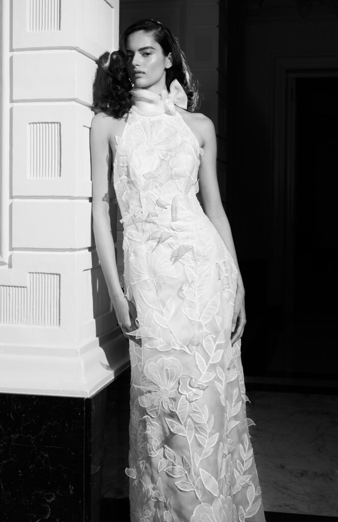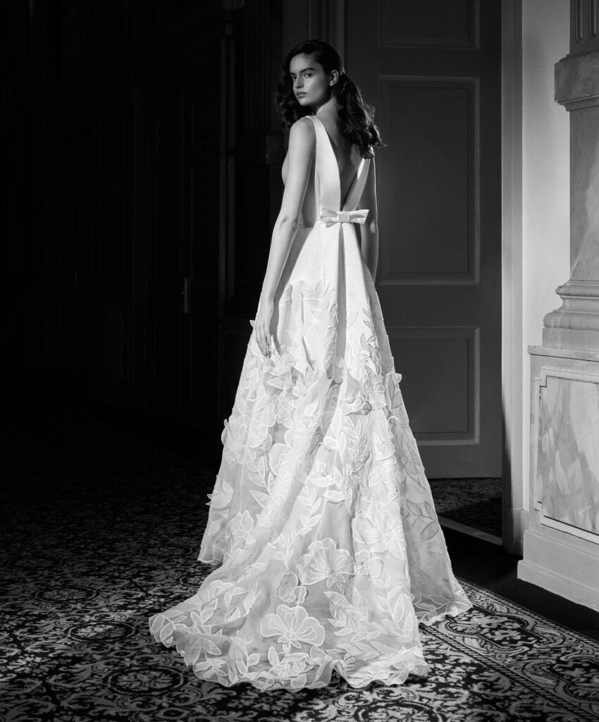 Dopo aver visto gli abiti da sposa scenografici giocati sui volumi, introduciamo un altro dettaglio signature del brand: i dettagli floreali.