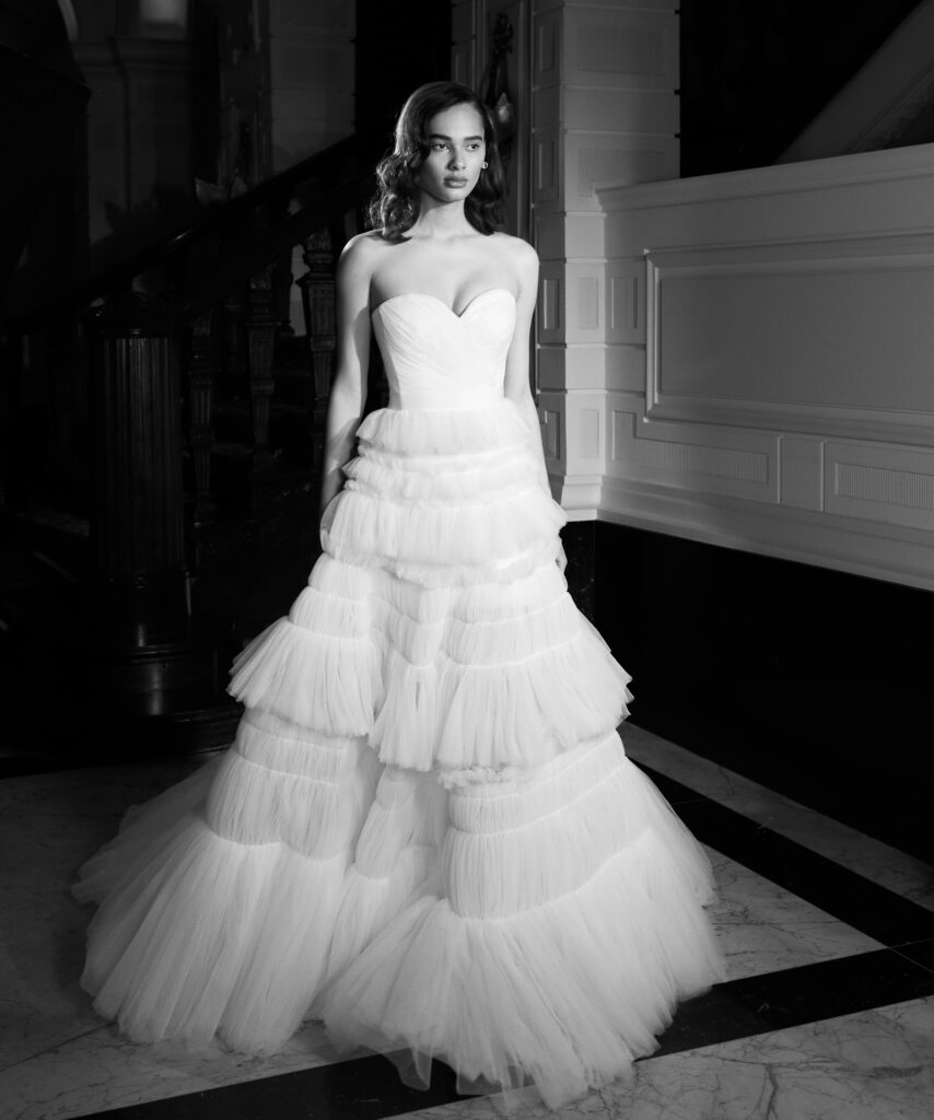 Infine, lussuoso l’abito bustier realizzato in organza di raso con corpetto drappeggiato in tulle, cintura in gros-grain, tasche e scollatura a cuore. L'opera d'arte con volant in tulle fumo cade lungo la gonna A-line e si drappeggia in un grazioso strascico.