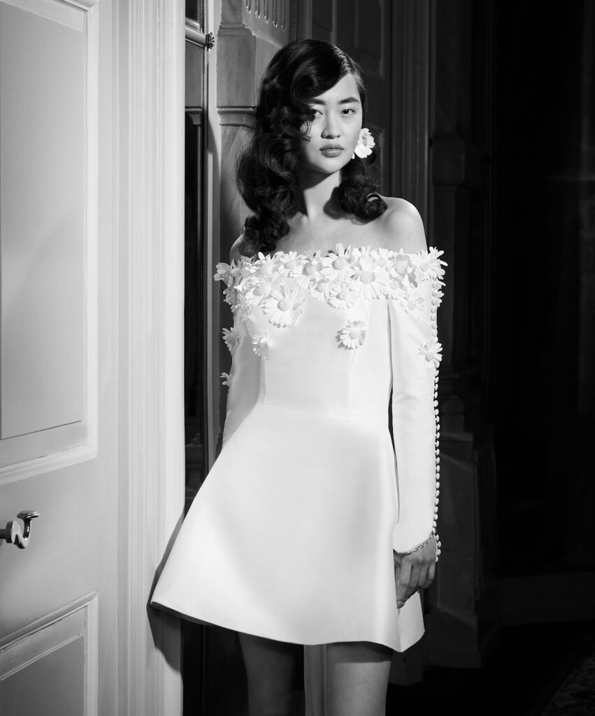 Spettacolare l’abito corto A-line realizzato in mikado con una leggera elasticità che permette al vestito di modellarsi perfettamente al corpo. L’abito è caratterizzato da una scollatura off-the-shoulder impreziosita da margherite in raso anni '60 lavorate a mano e decorate con centri ricamati in cristallo trasparente. Delicati bottoni ricoperti di tessuto adornano le maniche lunghe.