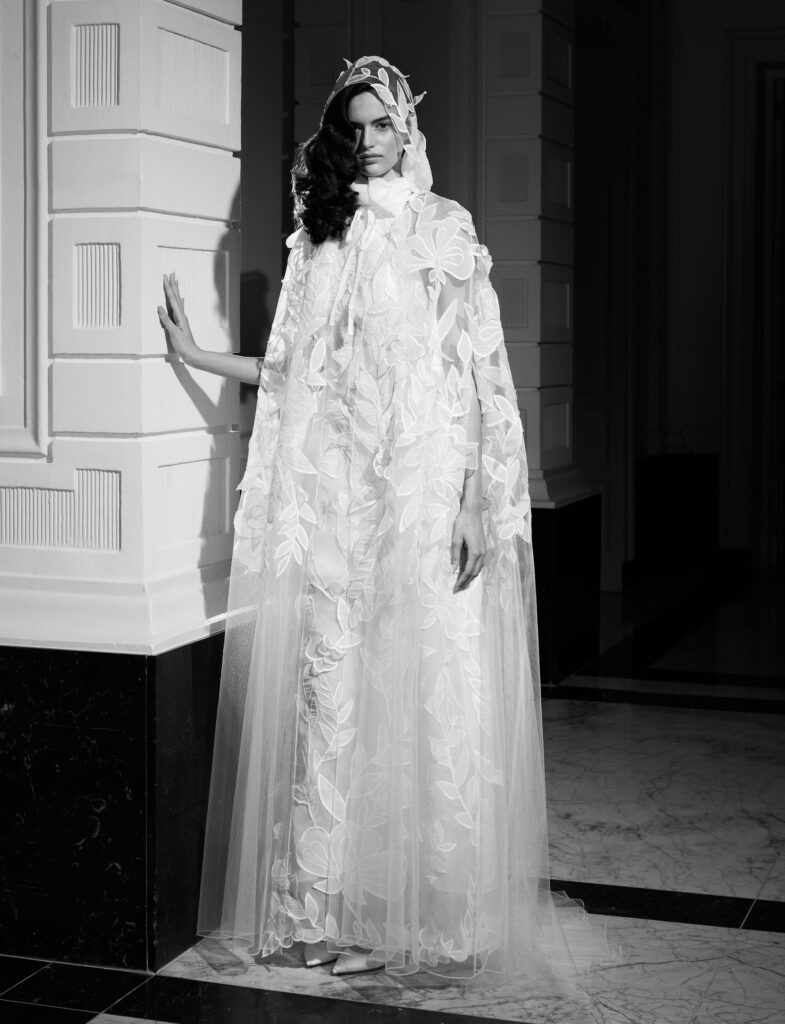 L’abito può essere abbinato ad una mantella in tulle con chiusura con nastro in gros-grain e fiori di pizzo in organza che scendono lungo il cappuccio e sfumano nello strascico in tulle trasparente.