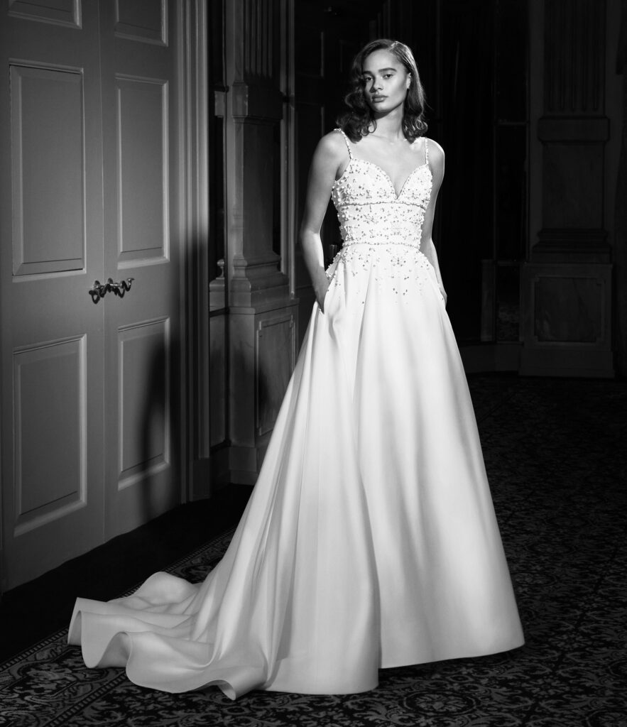 Bellissimo abito A-line realizzato in organza satin, con una delicata scollatura a bikini che lascia spazio a spalline ricamate, tasche e un grazioso strascico. Il ricamo si disperde sul corpetto con un luccichio abbagliante