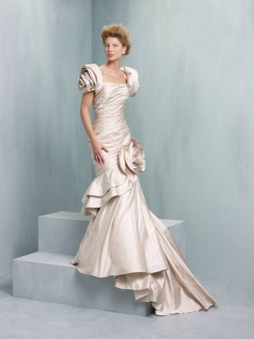 E' giocato sul tema del fiore anche l'abito Kahlua, dal look decisamente vintage, in pizzo e taffetà metallico, sfumato color miele.